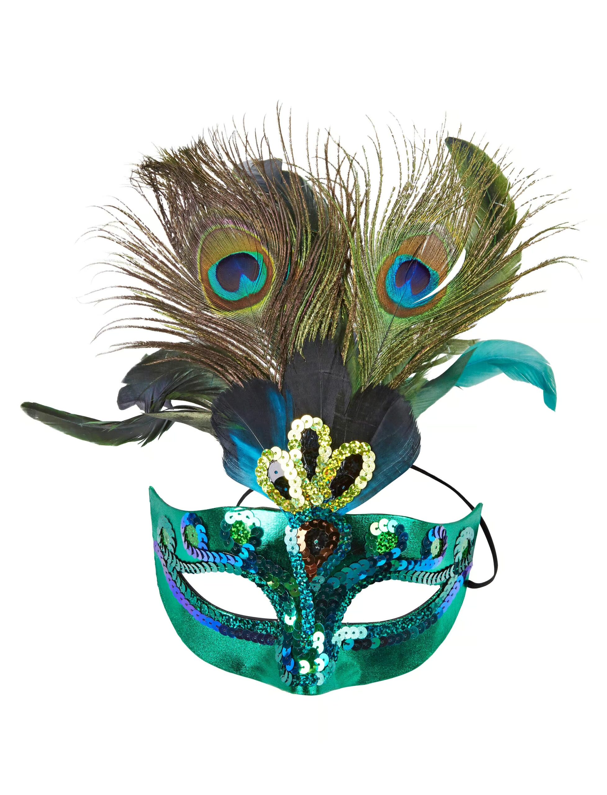 Als Pfau bist Du ein stolzes Tier, das mit hoch erhobenem Kopf sein prächtiges Gefieder präsentiert. Mit dieser wundervollen Maske verwandelst Du Dich in einen wunderschönen Pfau! Die glänzende Maske ist mit prächtigen Pfauenfedern geschmückt und mit Konturen aus grünen Pailletten versehen. Genau das Richtige für Maskenball, Mottoparty oder Karneval! Kombiniere zu dieser Maske noch ein paar Kostüm- oder Zubehörteile, um Dein Pfauenkostüm zu komplettieren.