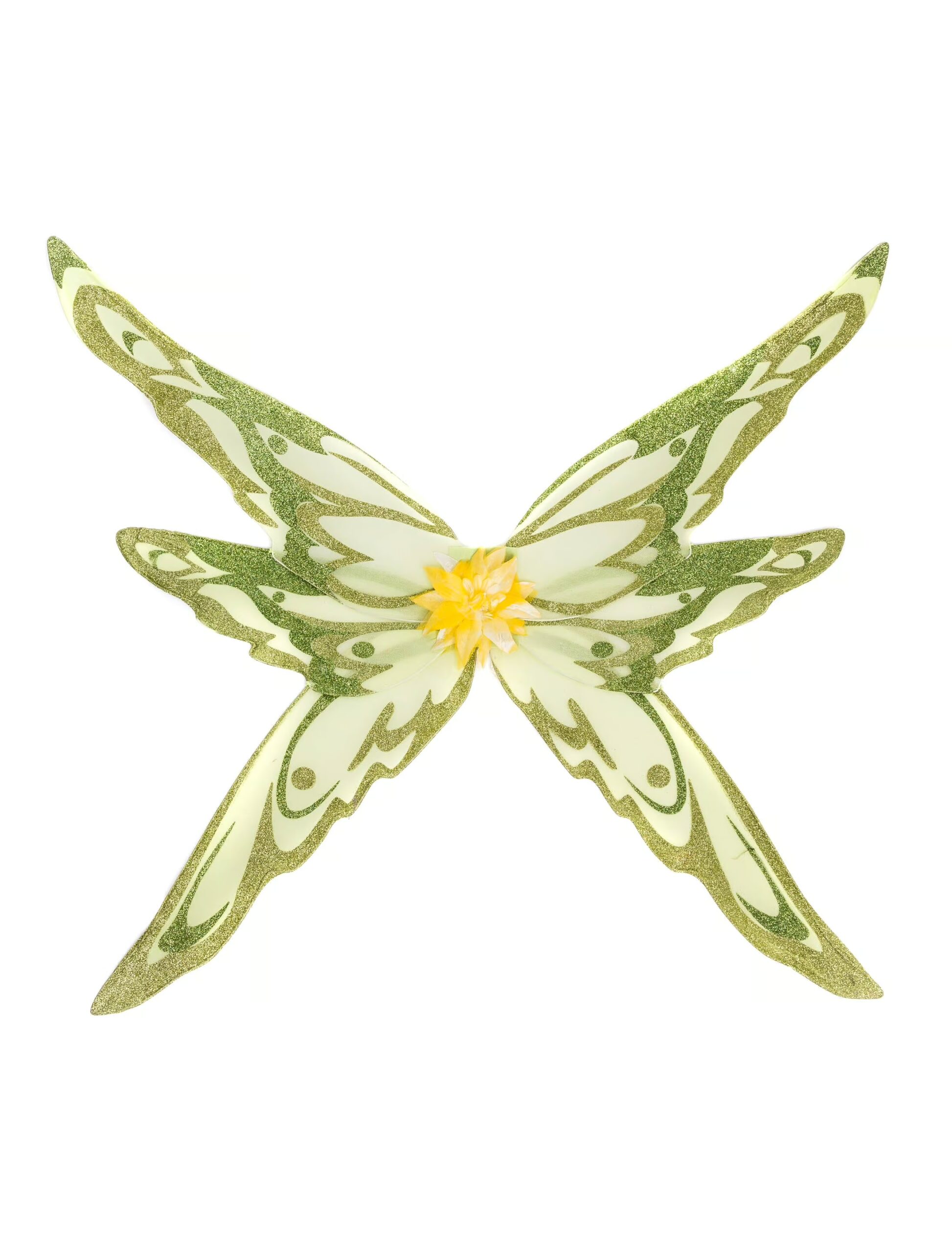 Mit diesen herrlichen Feenflügeln gibst Du Deinem Kostüm den letzten Schliff! Die spitzen, hellgrünen Flügel sind mit einem aufwändigen Muster und einer hübschen, gelben Kunstblüte verziert. Genau die richtige Ergänzung für Dein Kostüm als Waldfee, Schmetterling oder andere märchenhafte Gestalt!