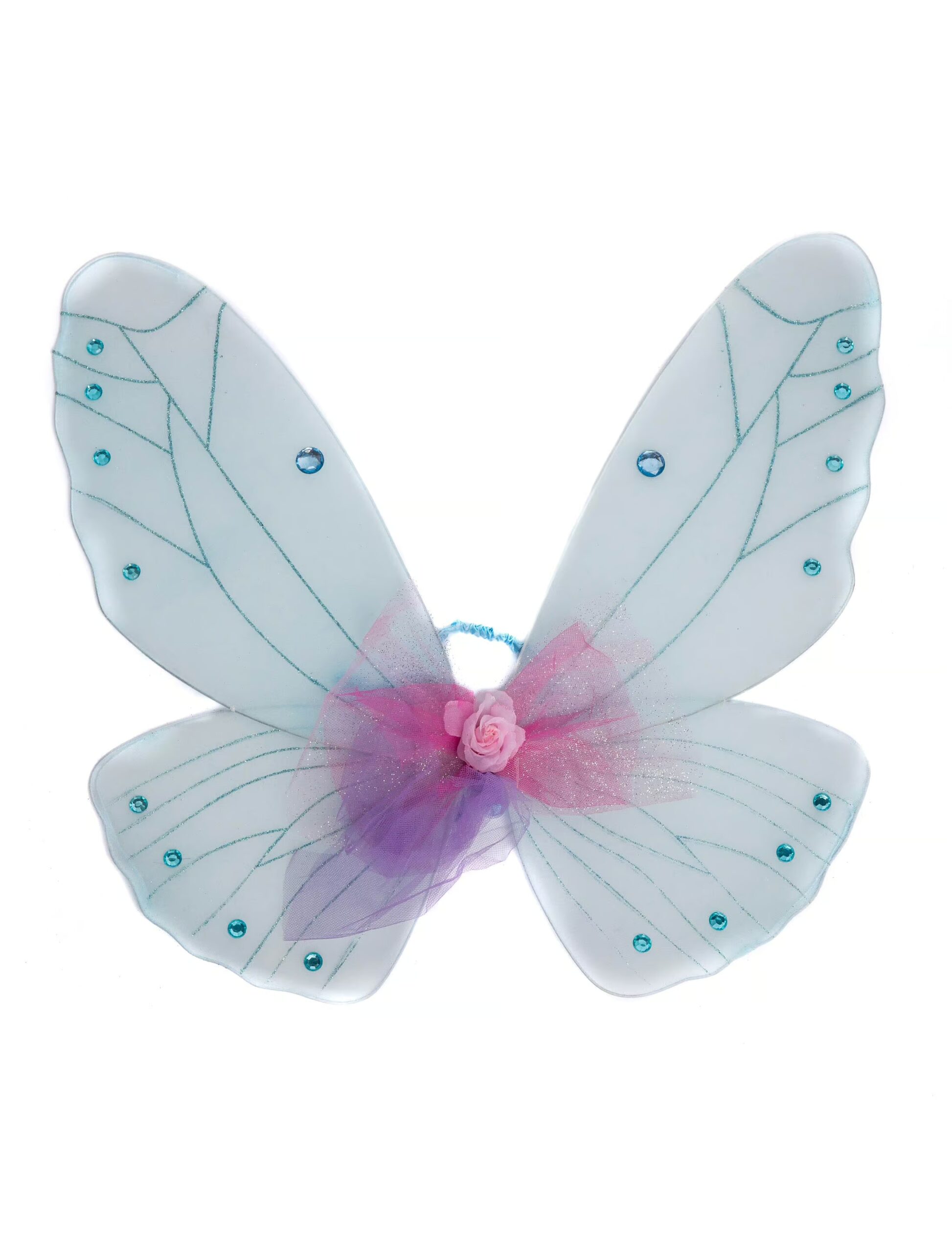 Mit diesen zauberhaften Flügeln gibst Du Deinem Kostüm den letzten Schliff! Die hellblauen Flügel sind mit einem aufwändigen Muster und einer hübschen Tüllschleife samt Kunstblüte verziert. Genau die richtige Ergänzung für Dein Kostüm als Fee, Schmetterling oder andere märchenhafte Gestalt!