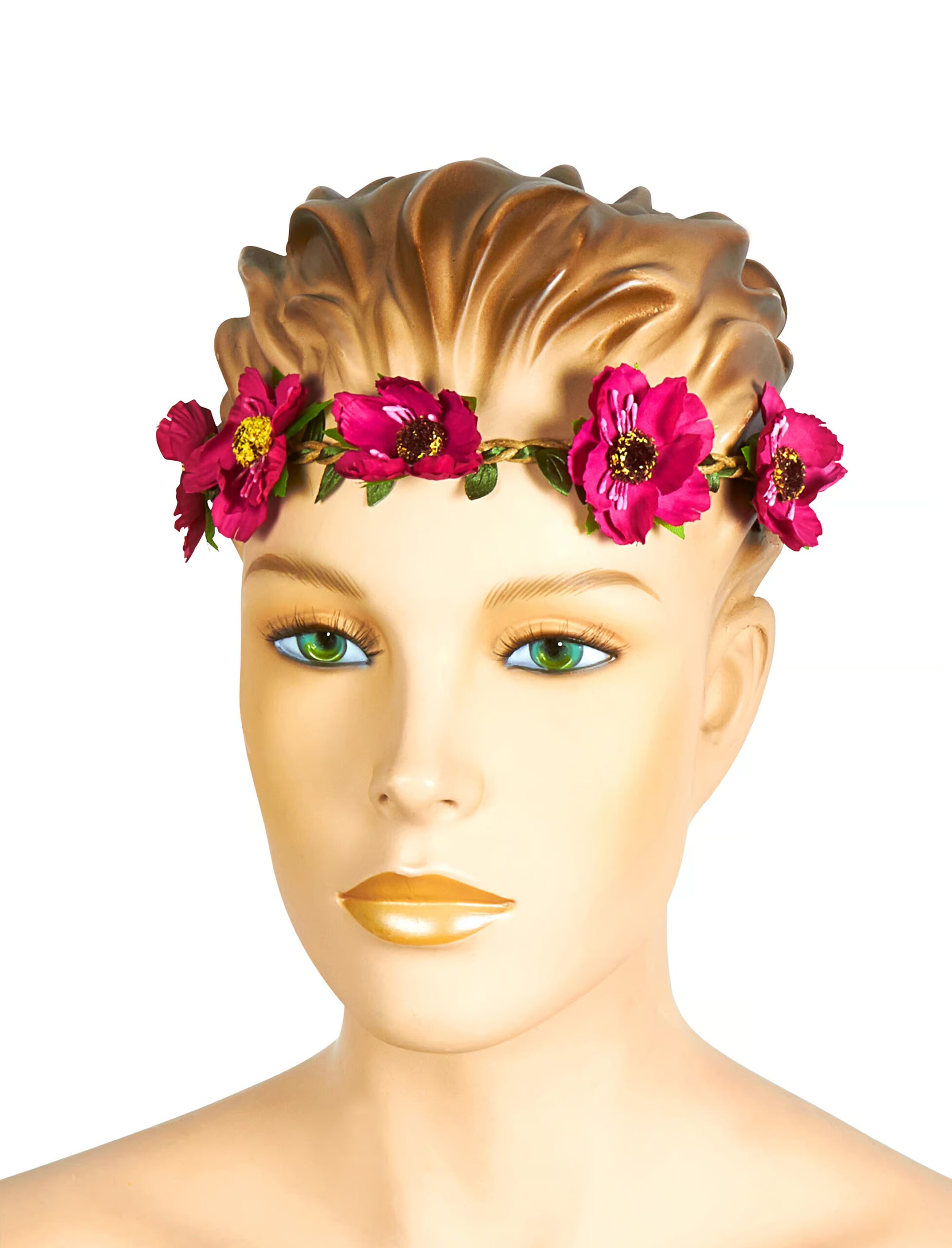 Dieses prächtige Haarband ist eine besonders hübsche Ergänzung für Dein Flower-Power-Outfit! Das Band ist im Stirnbereich in Flechtoptik gefertigt und mit täuschend echt aussehenden Polyester-Blüten geschmückt. Nach hinten verläuft es zu einem dezenten Gummiband. Die perfekte Kopfbedeckung für alle Hippies, Hawaiianer, Blumenmädchen und andere Natur-Liebhaber!