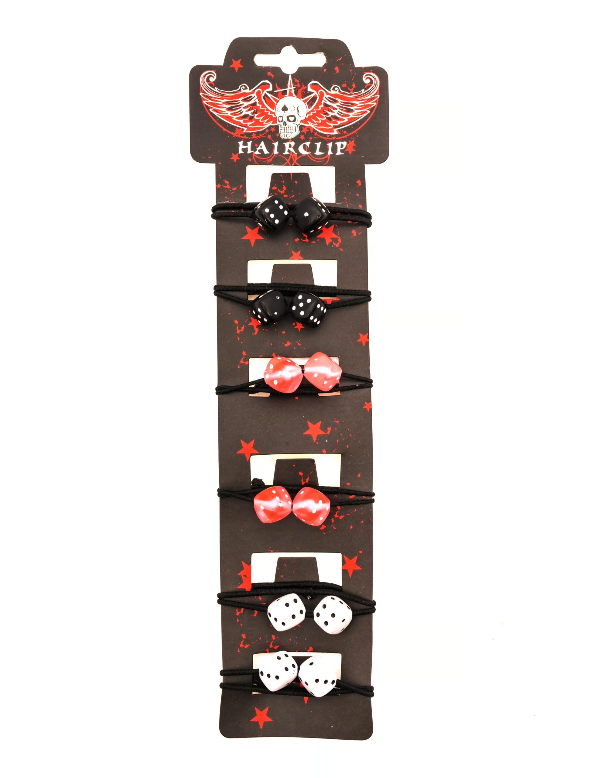 Stilvolle Accessoires für Dein Haar im Rockabilly- und 50er-Jahre-Look! Die sechs schwarzen Haargummis, die mit rosafarbenen, weißen oder schwarzen kleinen Würfeln versehen sind, sehen super zu in einem Pferdeschwanz, zu Petticoats, Tellerröcken und Tattoos aus. Wenn dann auf der nächsten Mottoparty auch noch Musik von Rocklegenden gespielt wird, hält Dich nichts mehr!