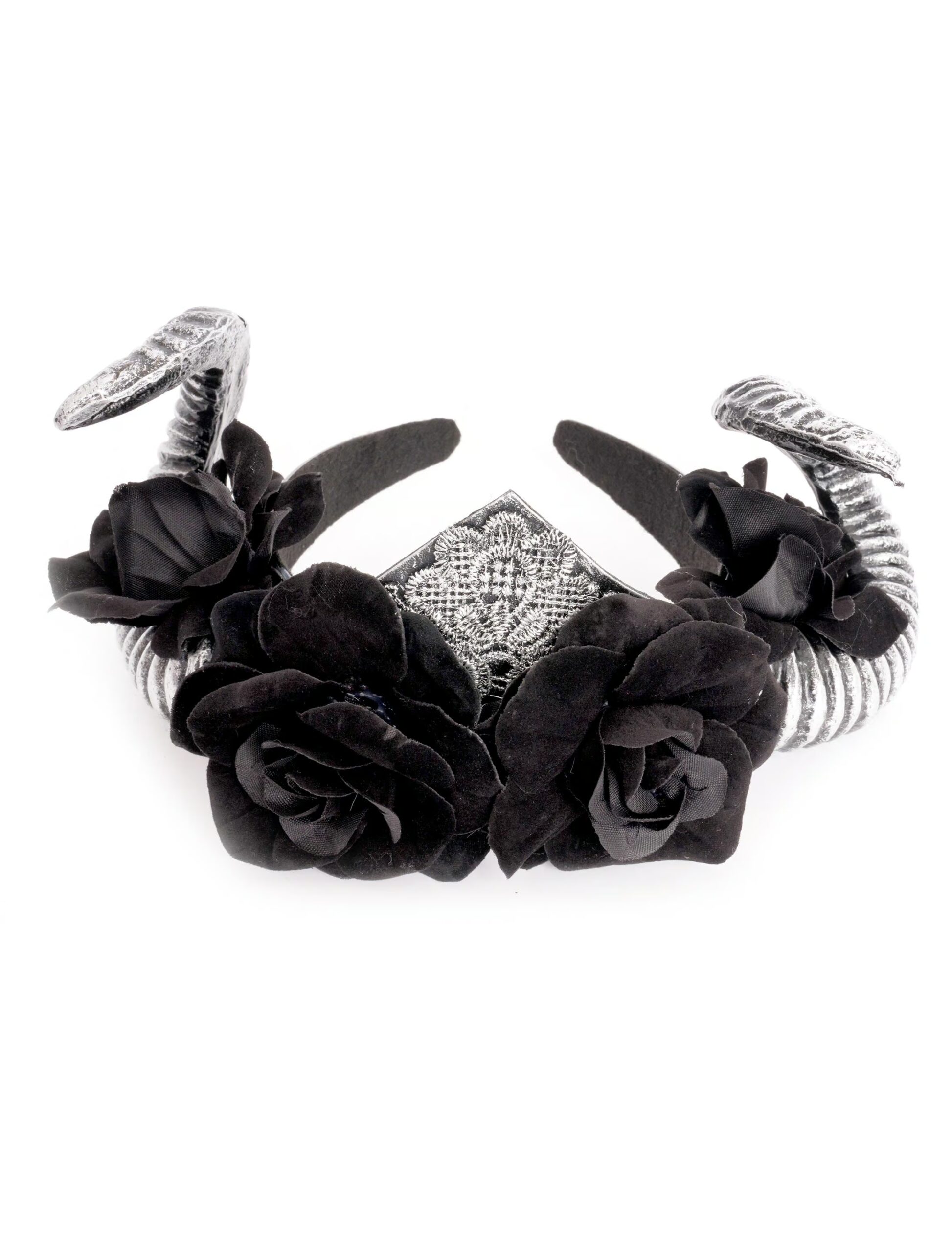 BEHORROR! Halloween steht wieder vor der Tür und Dir fehlt noch das passende Accessoire, das Dein schauriges Kostüm gekonnt abrundet? Wie wäre es mit diesem Haarreif, der mit schwarzen Rosen, einer floralen Stickerei und zwei silberfarbenen Hörnern verziert ist? Bei dem Anblick wird selbst den Untoten ganz warm!