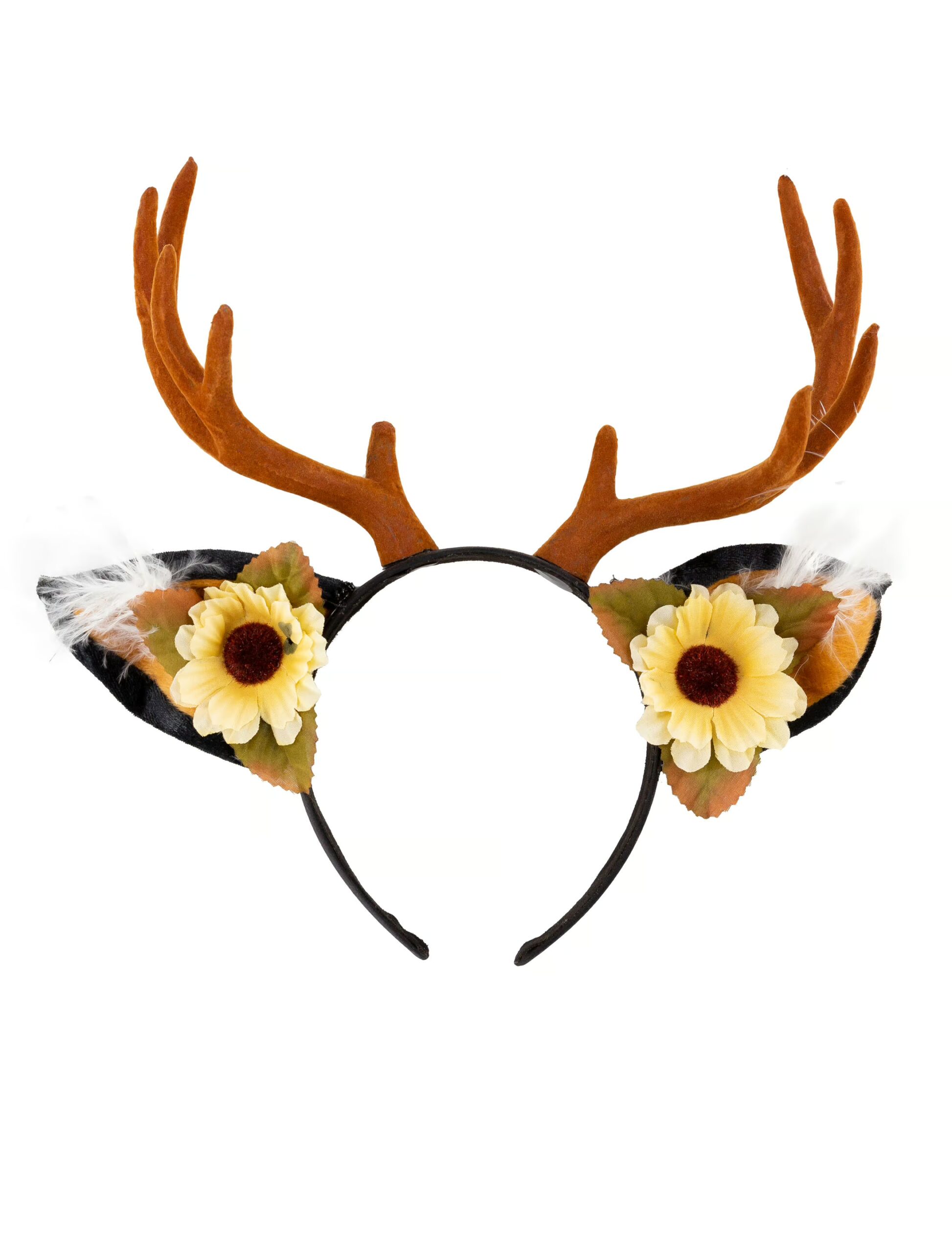 Mit diesem lustigen Haarreif ziehst Du garantiert alle Blicke auf Dich! Das auffällige Geweih ziert prachtvoll Dein Haupt, während die abstehenden Ohren anmutend mit herrlichen Sonnenblumen und echten Federn geschmückt sind. Das perfekte Accessoire für Dein Kostüm als Hirsch, fürs Volksfest oder den nächsten Junggesellenabschied!