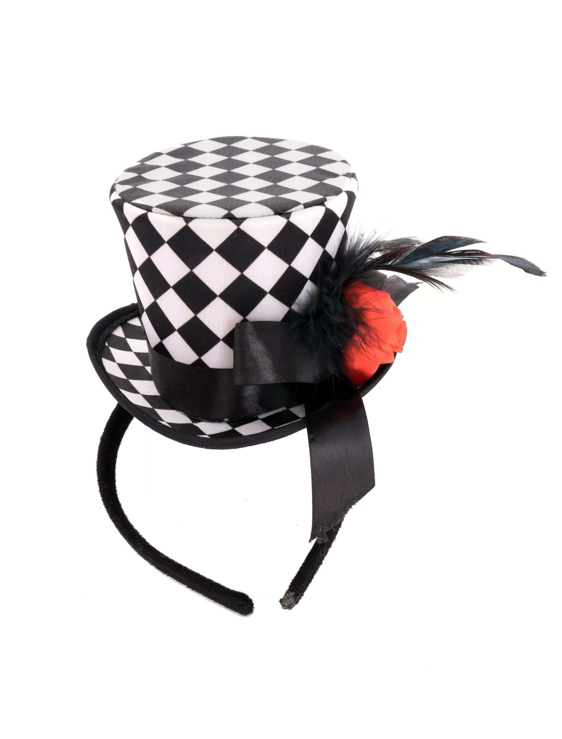 Dieser magische Zauberhut rundet Dein Outfit an Karneval und Fasching und auf jeder Party ab. Auffällig im schwarz-weißen Rautenmuster, wirkt das kleine, 9 cm hohe Hütchen wie ein Signal. Die schwarze Schleife mit der roten Rose als Dekor verleihen Deinem Outfit zeitlosen und eleganten Glanz. Der Haarreif ist für alle Größen passend, das Dekor aus Polyester ist leicht und unempfindlich.