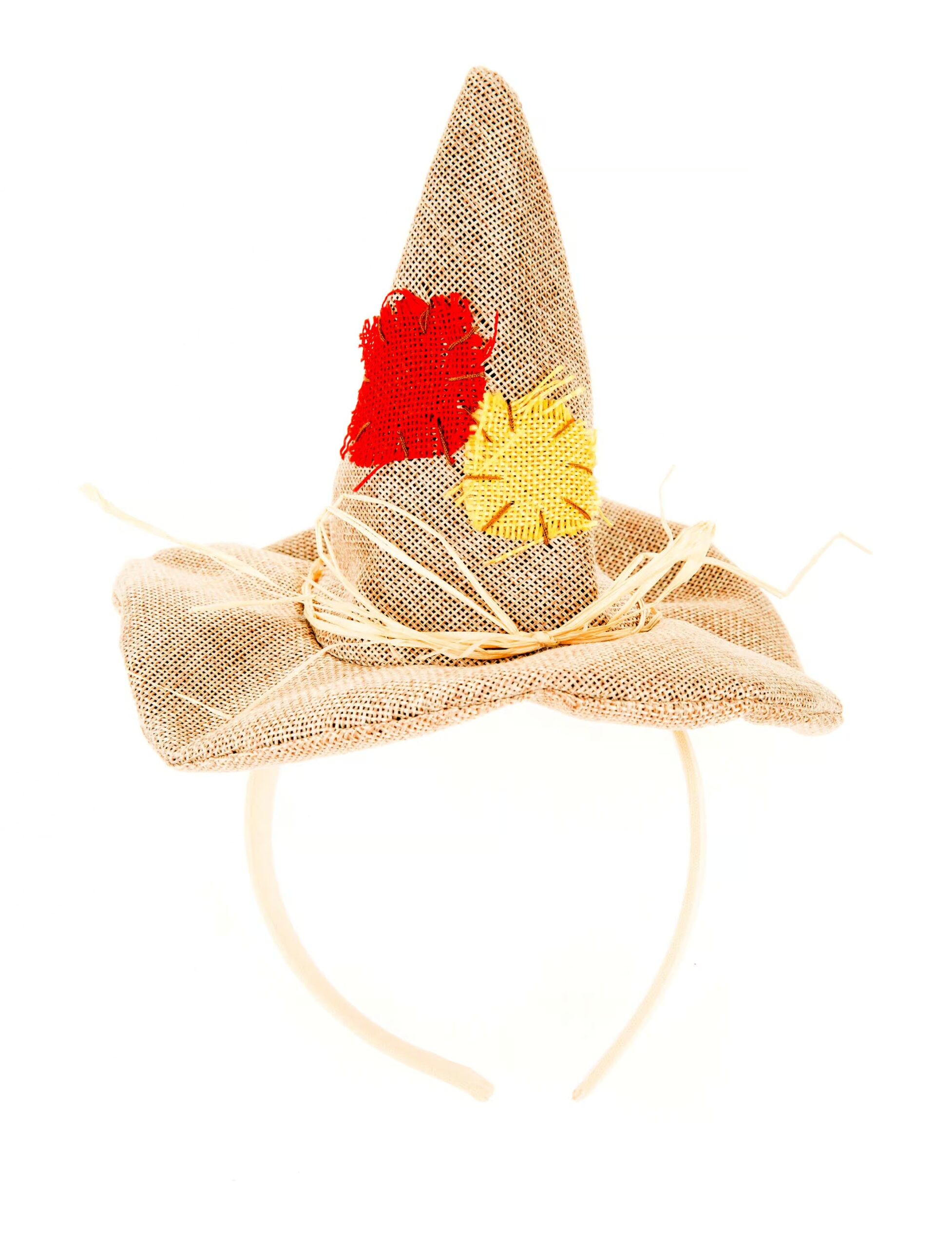 Dieser Minihut ist genau die richtige Ergänzung für Dein Kostüm als lustige Vogelscheuche! Der kleine, naturfarbene Spitzhut ist mit bunten Flicken und einem Hutband aus echtem Stroh geschmückt. Dank des dezenten Haarreifs bleibt Deine Kopfbedeckung fest an Ort und Stelle!