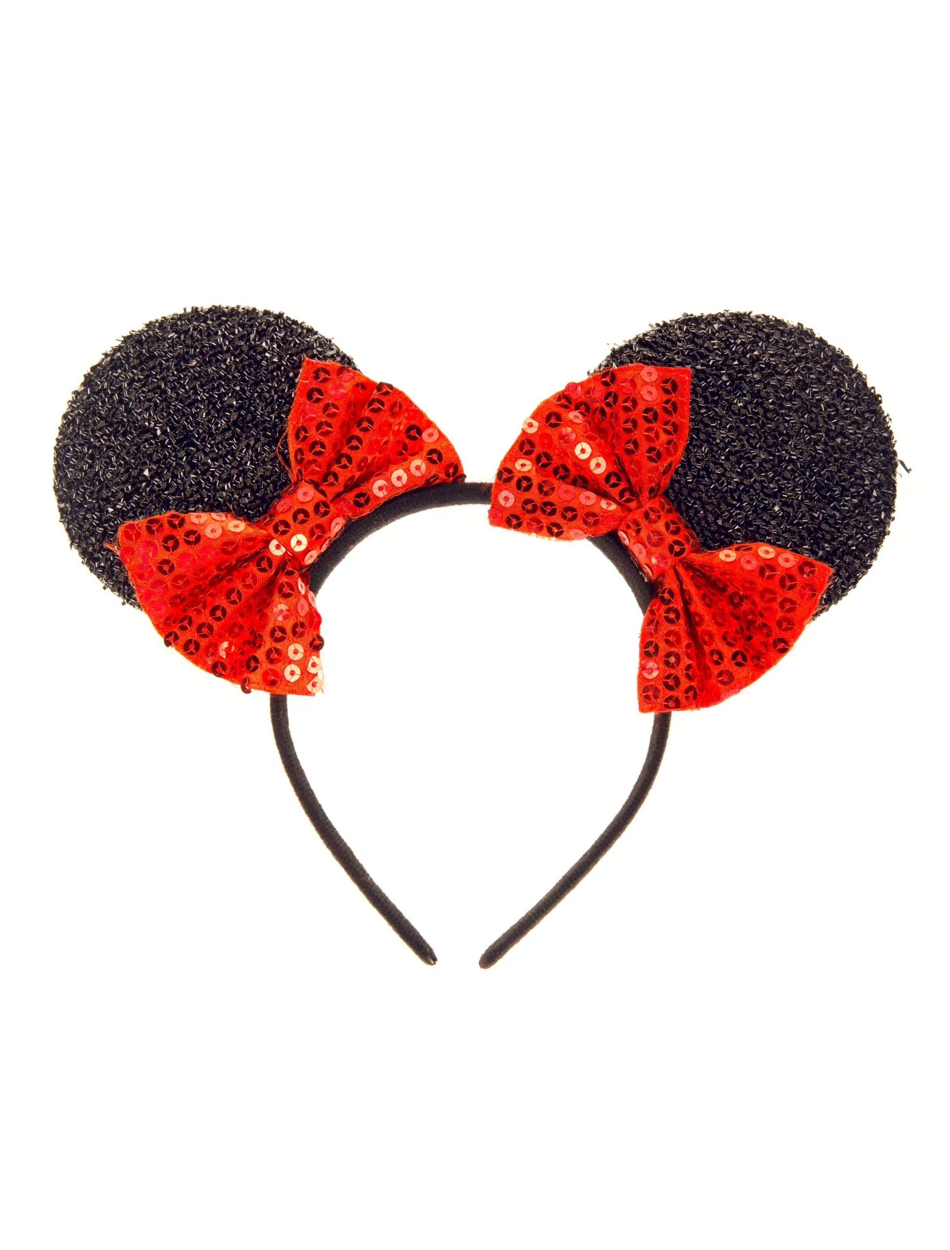 Mit diesem prächtigen Haarreif verwandelst Du Dich in eine besonders süße Mini Maus! Die schwarzen, großen Ohren sind hübsch mit Glitzer verziert und auch die roten Schleifen funkeln herrlich, dank der glitzernden Pailletten. Eine unverzichtbare Ergänzung für Dein Kostüm als Mini Maus!
