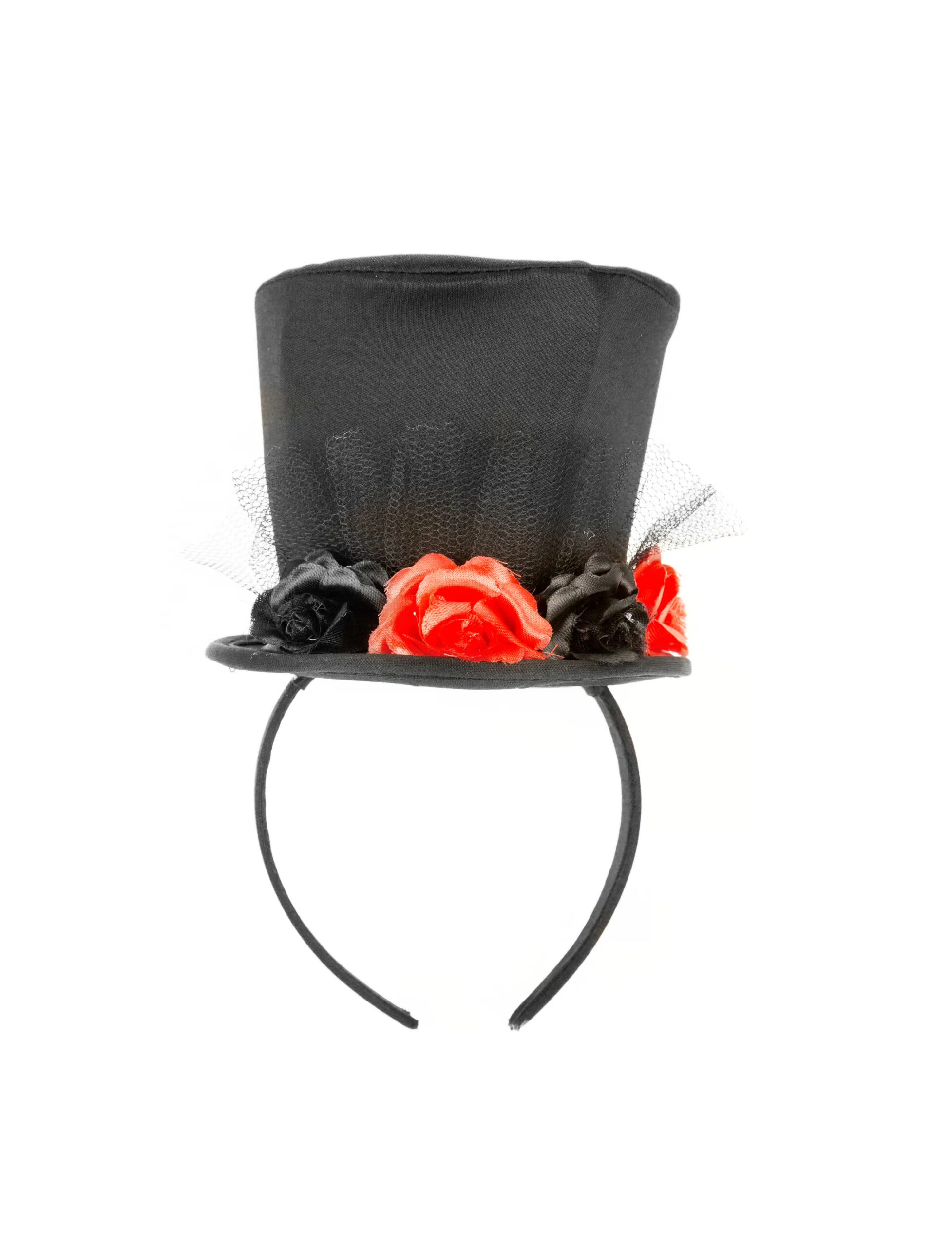 Kostümzubehör Haarreif Mini Zylinder schwarz mit roten Rosen
