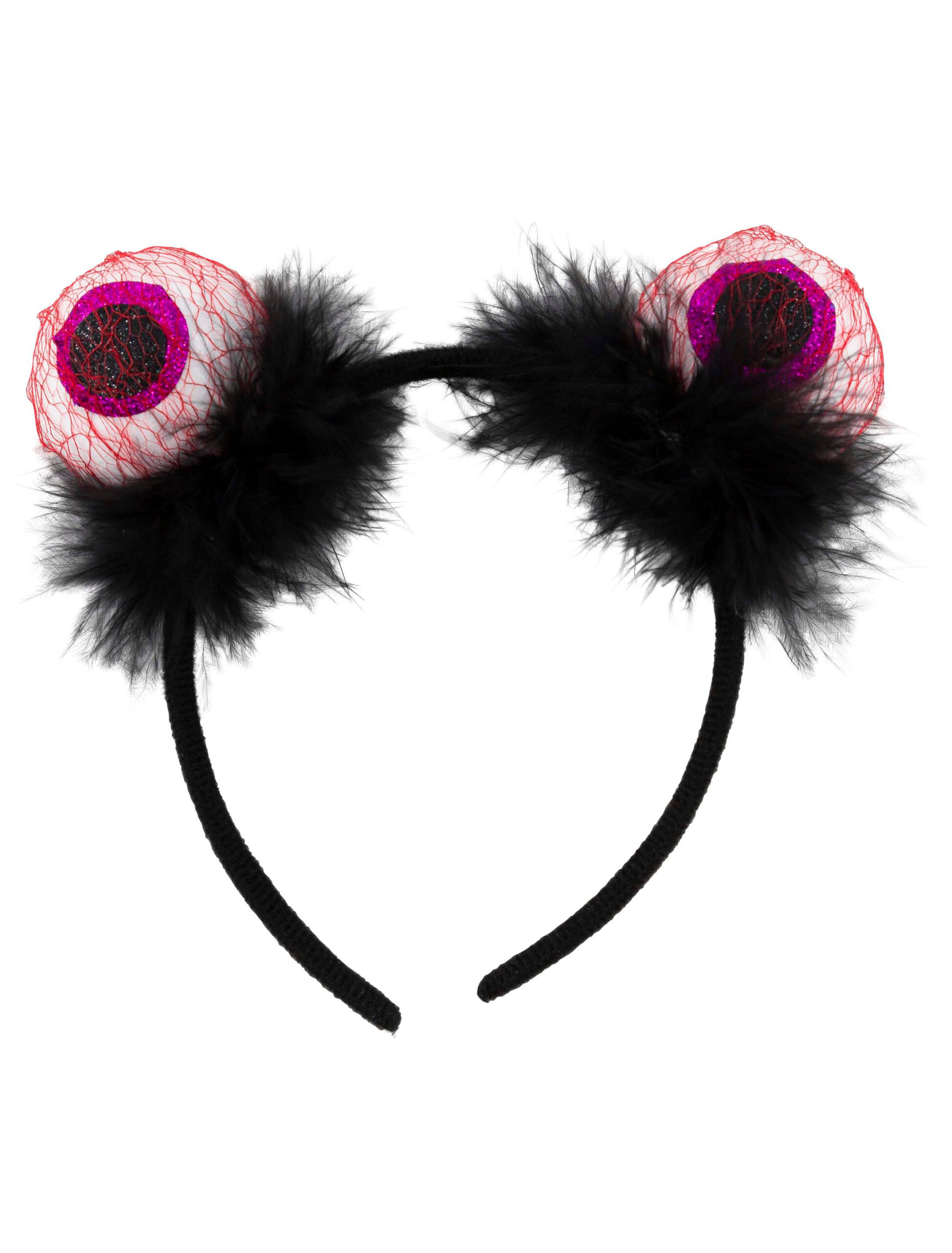 Wenn Du die Blicke auf Dich ziehen möchtest, dann ist der gruselige Haarreif mit Augäpfeln das passende Accessoire für Dich. Denn auf dem Haarreif mit schwarzen Federn thronen zwei 6,5 cm große Augäpfel. Der Haarreif ist aus 100% Polyester gefertigt. Ein idealer Kopfschmuck für Dein Halloween Kostüm.