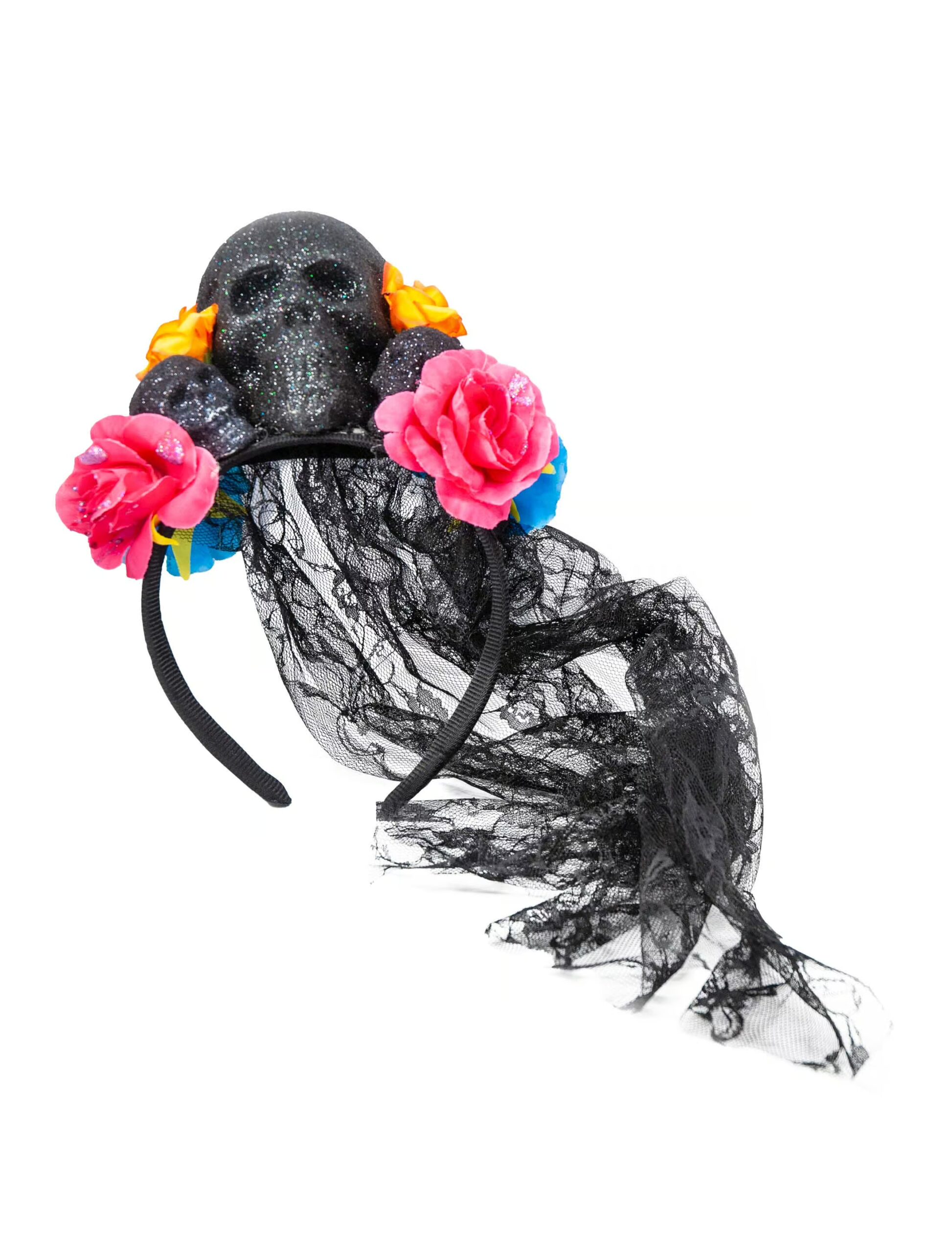 Du bist zu einer Halloweenparty eingeladen und suchst noch den letzten Schliff für Deine schaurige Verkleidung? Gar kein Problem! Unser Haarreif mit schwarzem Schleier, Totenkopf und bunten Rosen darf hier nicht fehlen. Dieses schaurige Accessoire passt perfekt zu Deinem Halloween Kostüm mit dem Thema Dia de los Muertos (Tag der Toten). Das Produkt beinhaltet nur einen Haarreif.