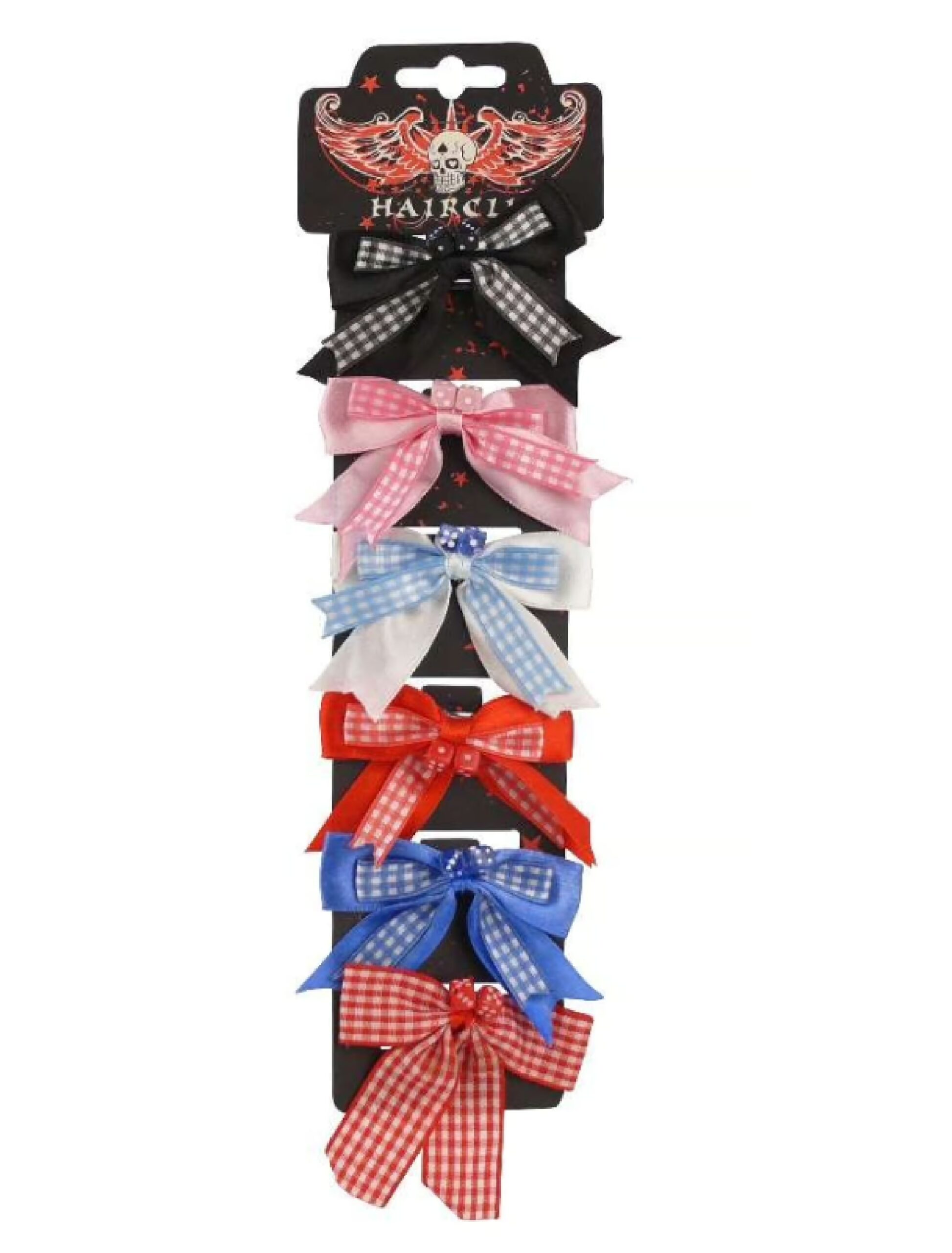 Wer auf Rockabilly steht und noch auf der Suche nach dem passenden Kopfschmuck ist, liegt mit dem sechsteiligen Haarspangen Set genau richtig. Die rot, blau, rosa und schwarzen Haarspangen kommen jeweils mit einer Schleife und zwei Würfeln daher. Jetzt kann die nächste rockige 50er Jahre Party starten!