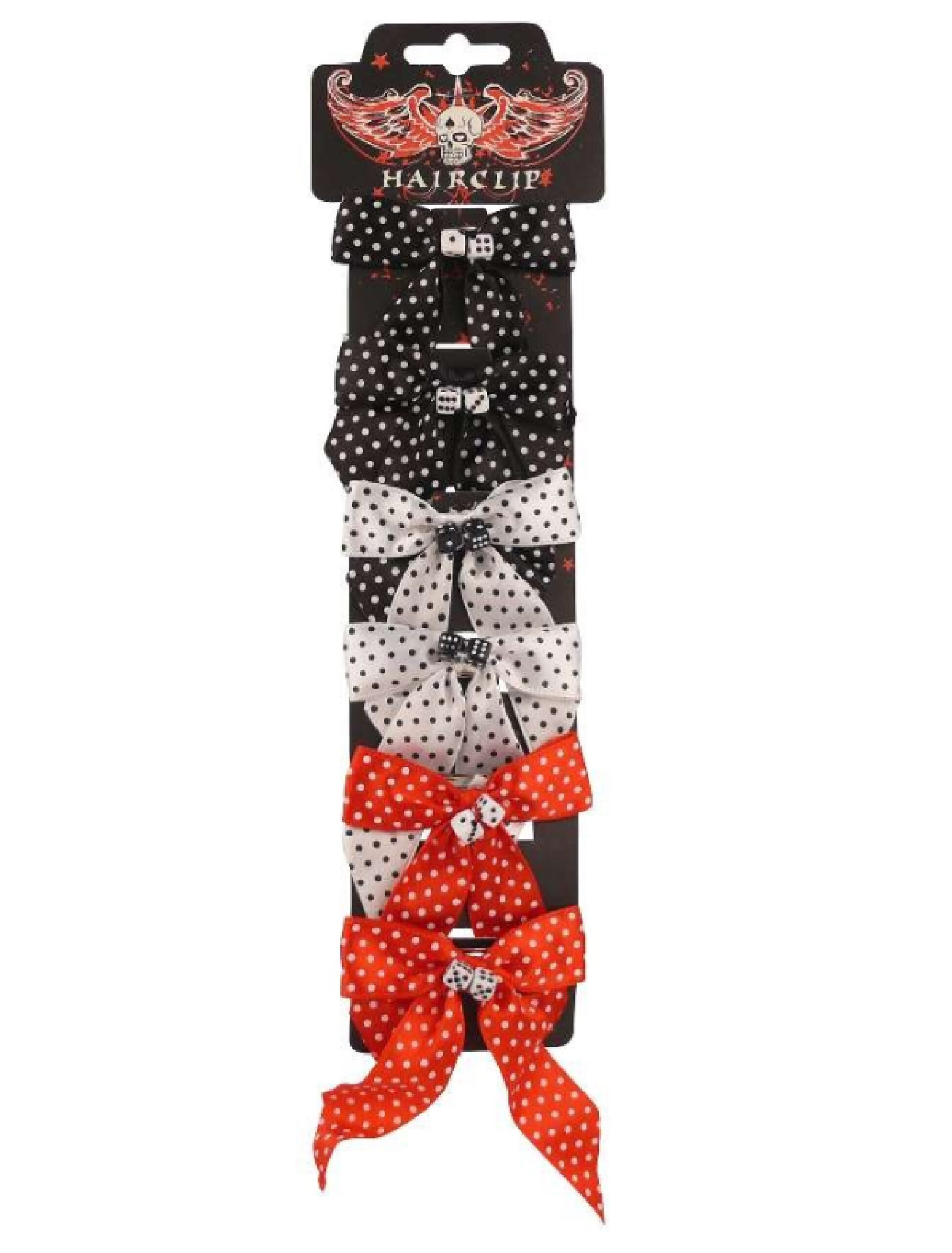 Der Klassiker für Rockabilly Girls! Die Haarspange mit Schleife samt Würfeln kommt gleich im 6er Pack daher. Jeweils zwei schwarze, weiße und rote Schleifen mit Punkten kannst Du Dein Eigen nennen, wenn Du das stylische Accessoire jetzt online kaufst. Auch geeignet als hübscher Geschenkartikel für eine gleichgesinnte Freundin.
