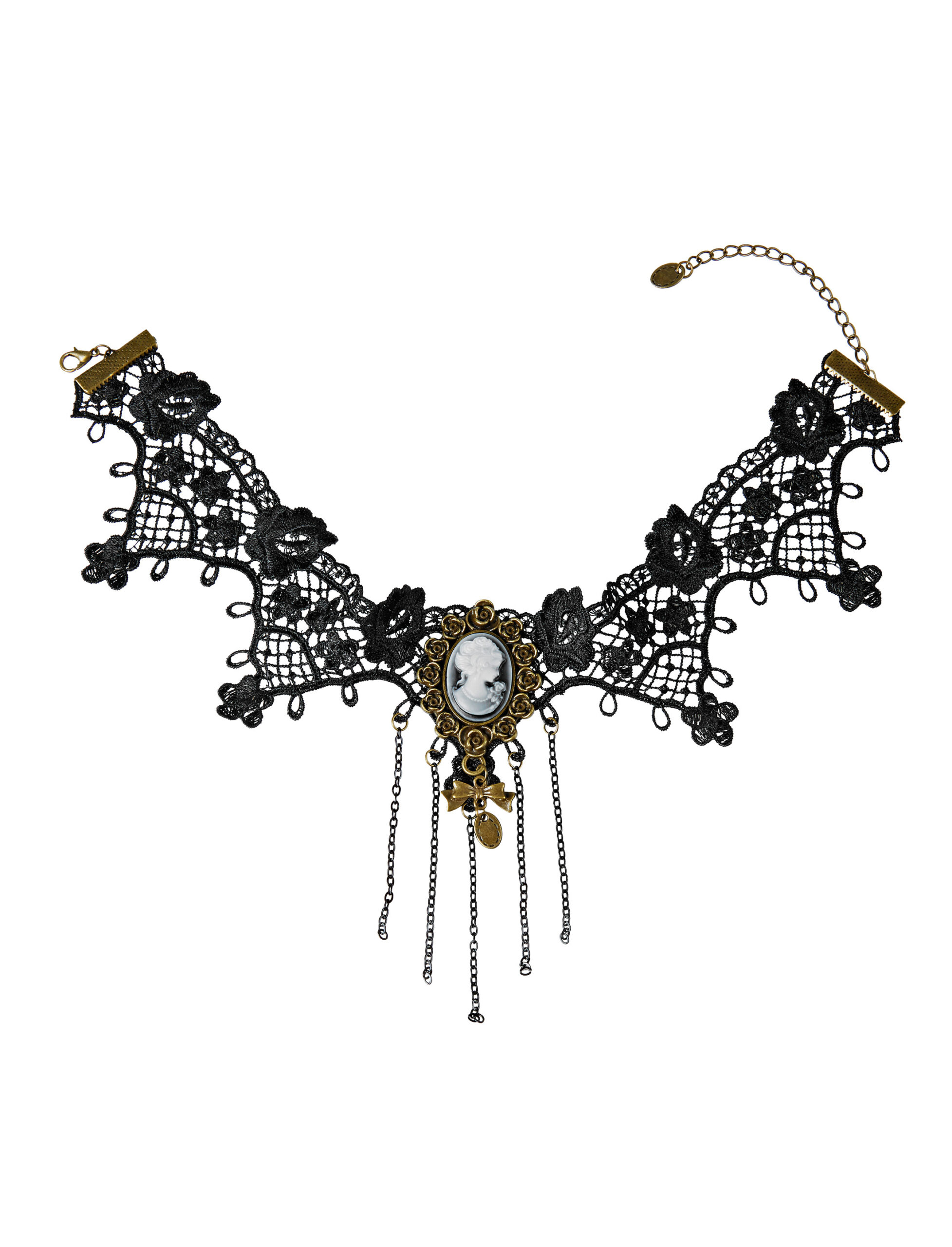 Edles Halsband, das jedes Gothic- oder Mittelalter-Kostüm eine ganz besondere Note verleiht. Das Schmuckstück besteht aus schwarzer Blumen-Spitze und wird in der Front von einer hübschen Kamee mit goldenem Rahmen umgeben. Die fünf Kettchen und der Schleifen-Anhänger lenken alle Blicke auf Dich!