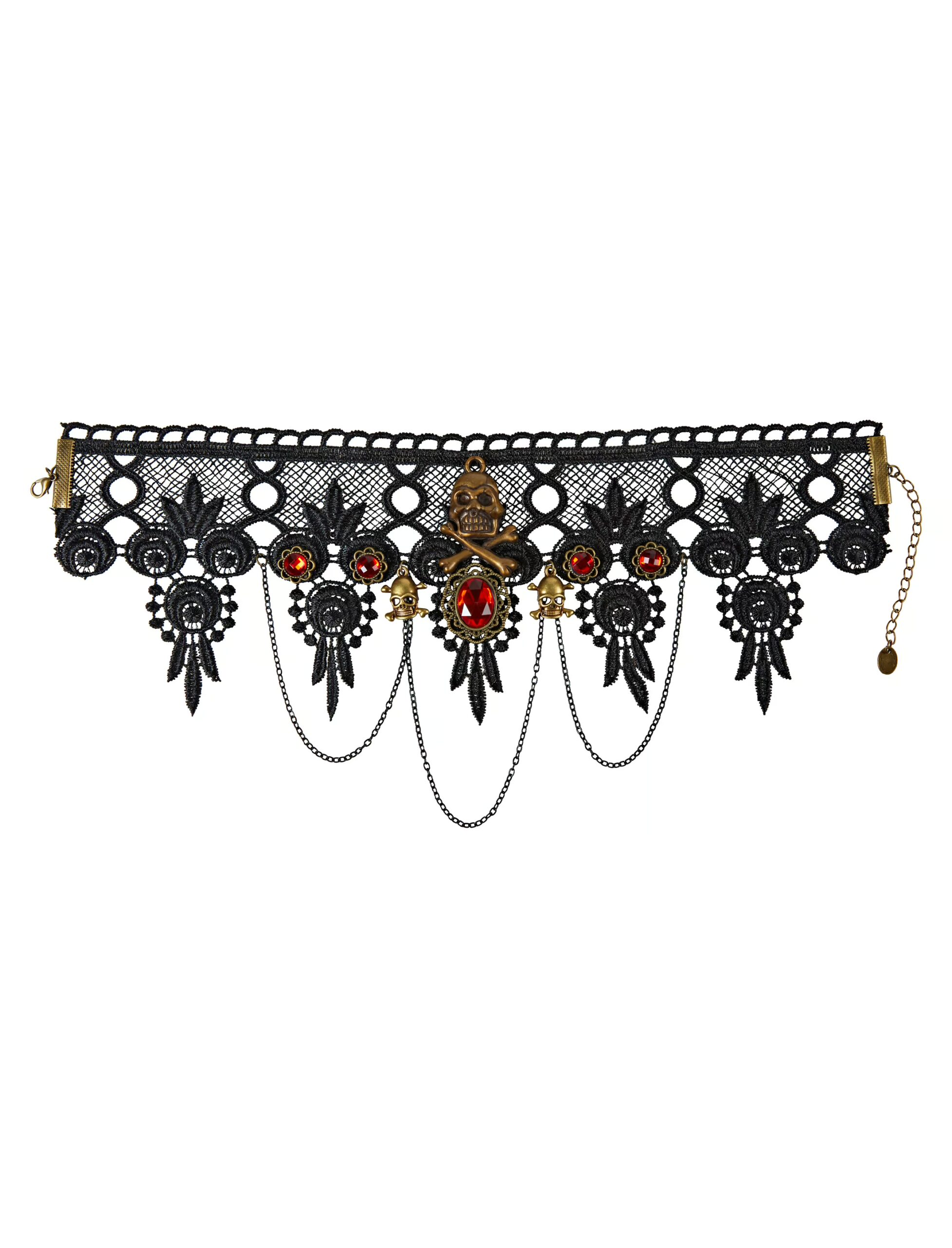 Kostümzubehör Halsband Spitze Totenkopf und rote Kristalle