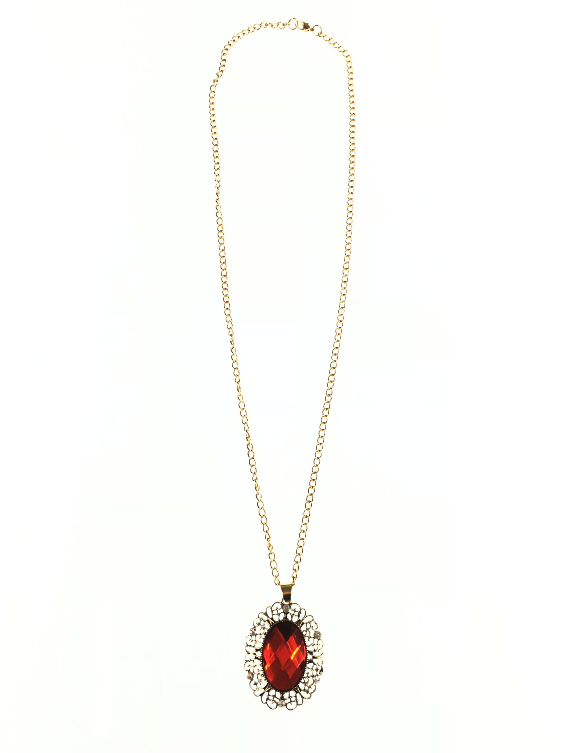 Du bist auf der Suche nach einem passenden Accessoire für Dein schickes Barock- oder Rokoko Kostüm? Diese goldene Halskette mit einem großen, roten Stein verwandelt Dein Kostüm in Nullkommanichts in einen richtigen Eyecatcher. Die Halskette hat eine Länge von ca. 65 cm, der Anhänger eine Größe von ca. 5 cm, sie bestehen beide aus Metall. Ein schönes Accessoire zu mittelalterlichen Kostümen!