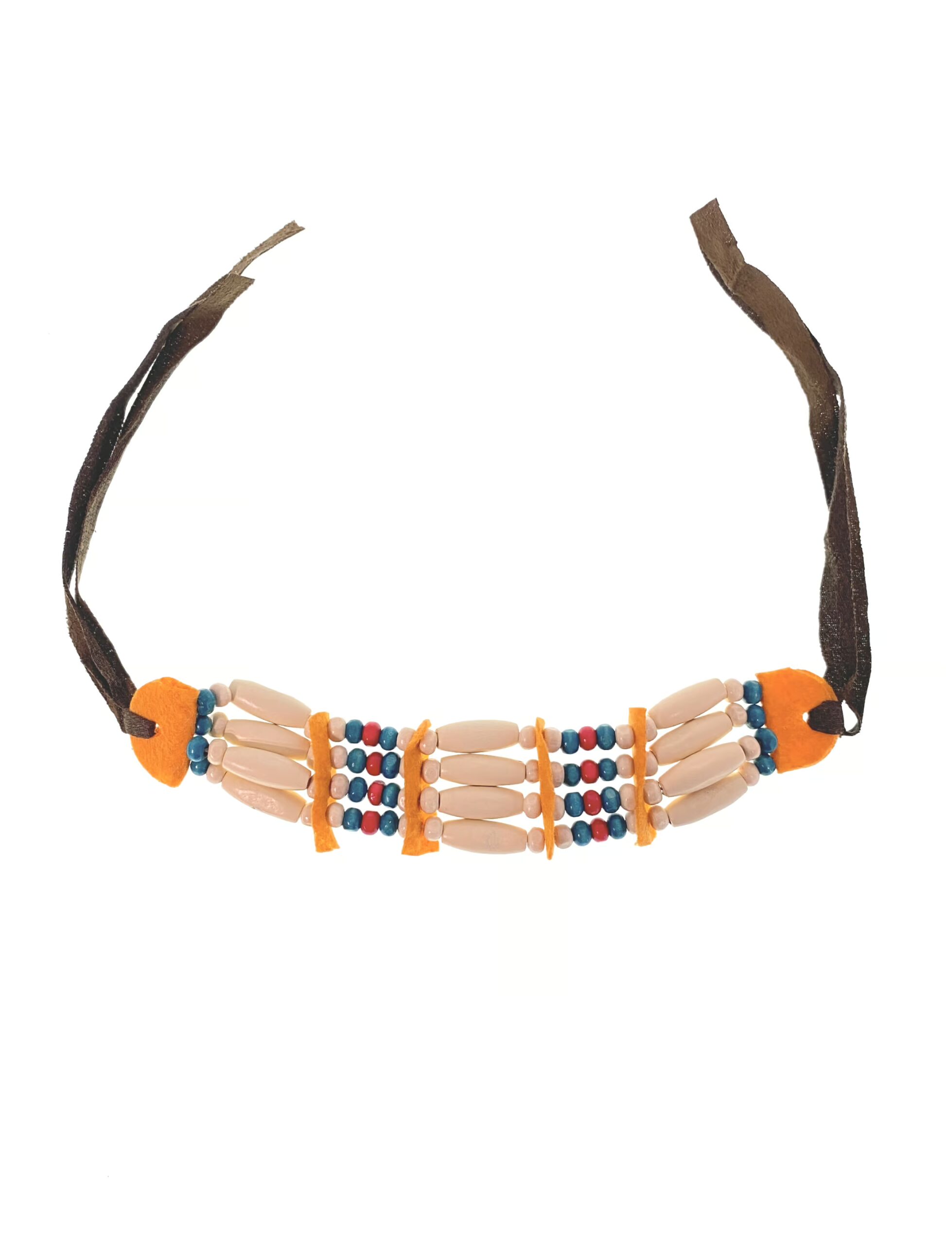Sehr apart ist diese schöne Halskette aus Holzperlen. Sie ist das ideale Accessoire um unsere bezaubernden Indianer Kostüme aus unserem Shop stilvoll und authentisch zu ergänzen. Die hübsche Halskette aus runden und länglichen Holzperlen sowie textilen Teilen im indianischen Look wird am Nacken mit Bändern fixiert. Sie ist ein attraktiver Hingucker mit dem Du auf Wildwest-Partys, zum Fasching, Karneval oder Halloween garantiert punktest.