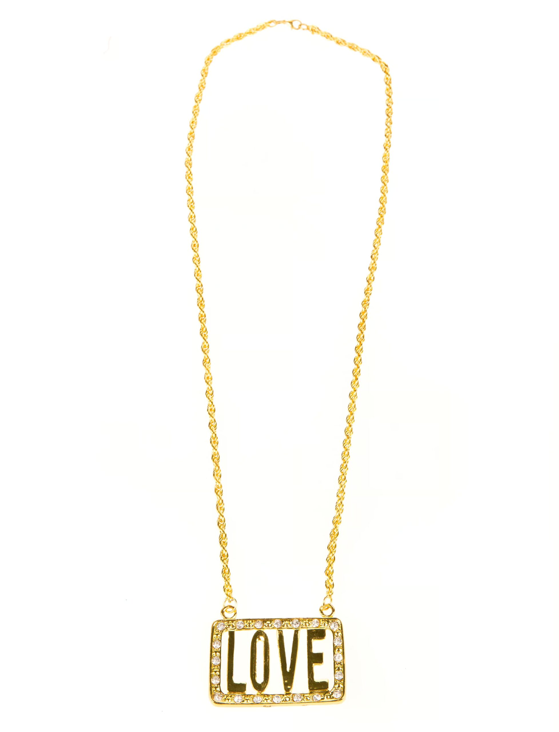 Liebe zum Umhängen: mit dieser protzigen Halskette zeigst Du jedem, wie wichtig Dir die Liebe ist! Die goldene Kette ist aus Metall gefertigt und mit einem fetten LOVE-Schriftzug als Anhänger versehen. Genau das richtige Accessoire für Dein dekadentes Outfit als Partyqueen, Rapper oder Asi-Braut!
