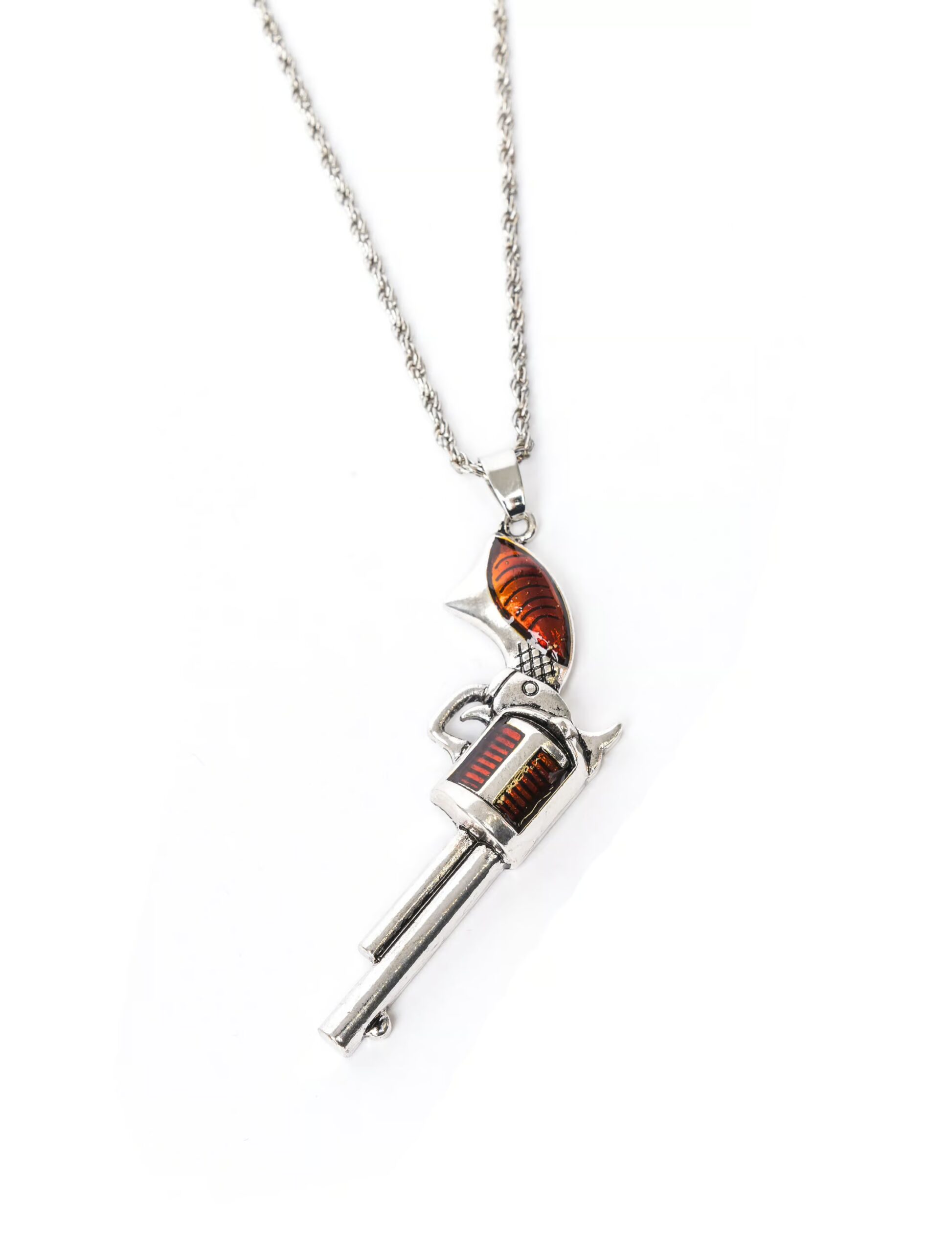 Bist Du auf der Suche nach einer schönen, simplen Halskette mit einem etwas außergewöhnlicheren Anhänger? Wie wär es mit unserer Revolver-Kette? Der etwa 6 cm große Pistolen-Anhänger sowie die ca. 50 cm lange Kette bestehen beide aus Metall und sie lässt sich mit einem Karabiner-Verschluss verschließen. Dadurch, dass sie silber ist und an der Pistole braune Details hat, kannst Du sie zu jedem erdenklichen Cowgirl-Outfit kombinieren.