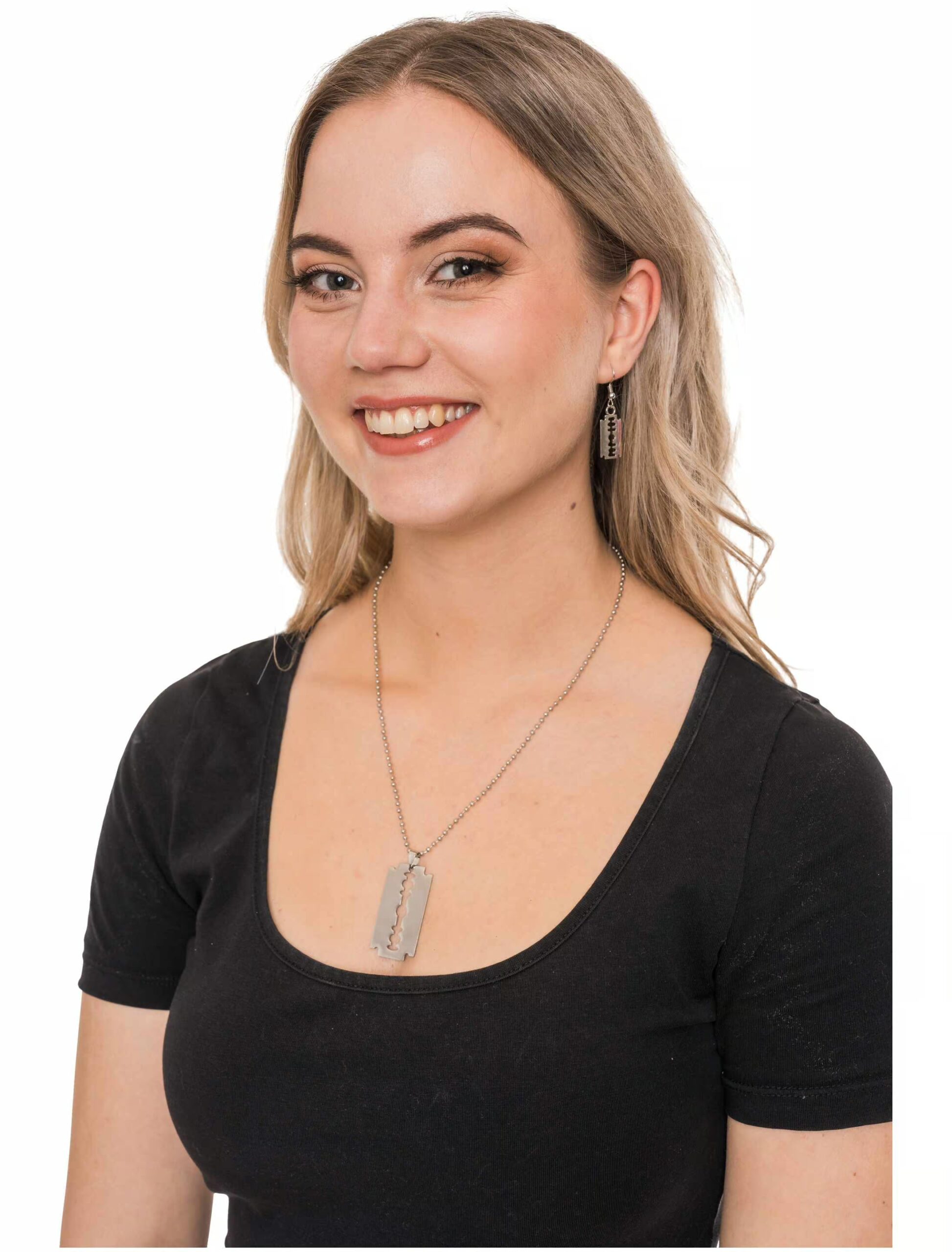 Du willst ein Accessoire, das so scharf ist wie dein Style? Dann ist unsere Halskette mit einem Rasierklingen-Anhänger genau das Richtige für dich! Minimalistisch, edgy und mit einer ordentlichen Portion Attitüde. Ob als Highlight zu deinem Punk-, Grunge- oder Halloween-Outfit – diese Kette ist ein echter Hingucker. Kombiniert mit Lederjacke, Boots oder einfach deiner coolen Ausstrahlung wird der Look perfekt. Also, leg dir diese Kette um und zeig allen, dass dein Style genauso messerscharf ist wie du selbst!