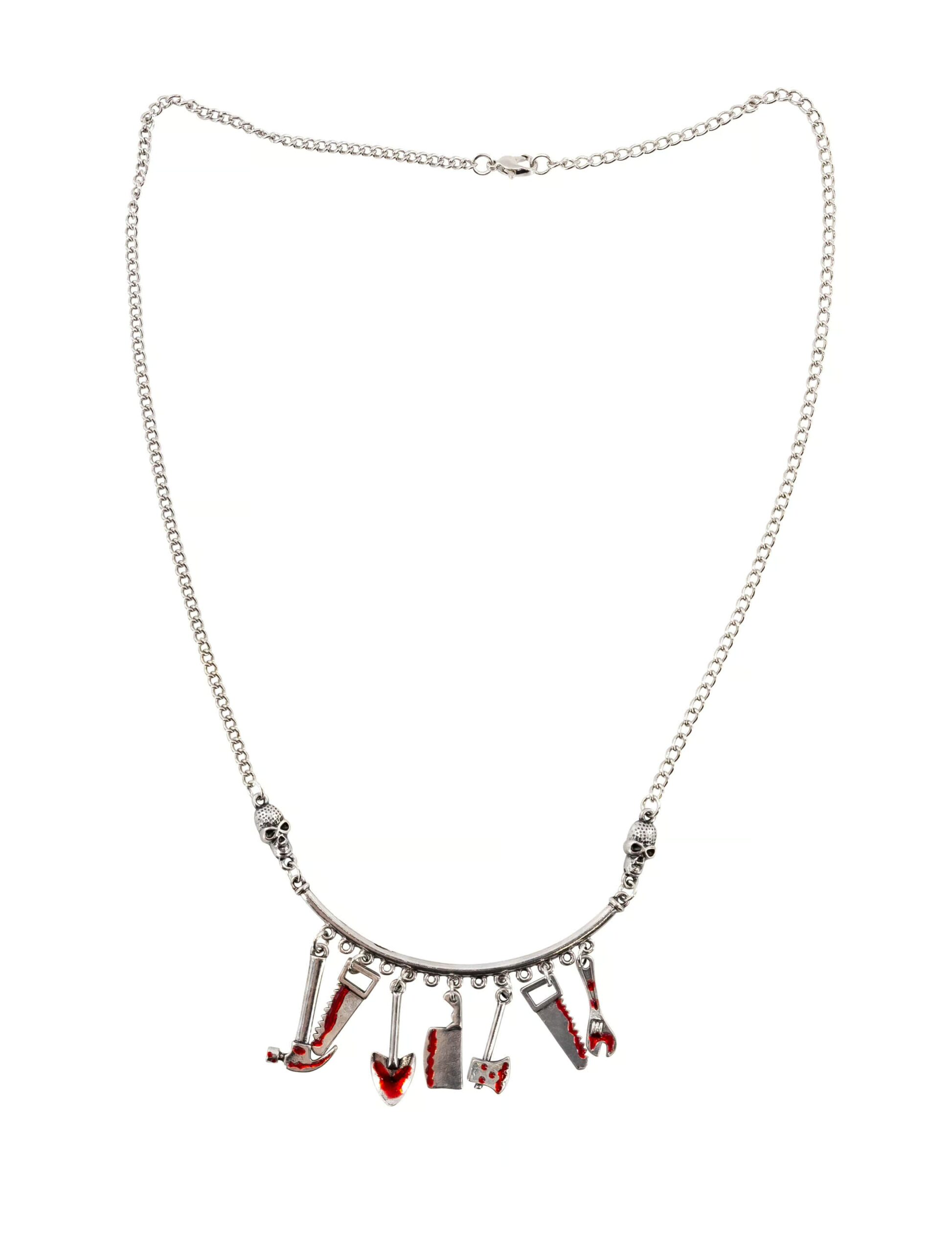 Statement pur! Mit dieser extravaganten Halskette beziehst Du ganz klar Stellung: Halloween ist Dein Lieblingstag! Das silberfarbene Schmuckstück ist mit Totenköpfen und vielen blutigen Werkzeugen wie Hammer, Axt, Säge, Schaufel, Beil und Schraubenschlüssel verziert, die allesamt perfekt zu schaurig-schönen Halloween Kostümen passen. Ein toller Hingucker für die düsterste Nacht des Jahres!