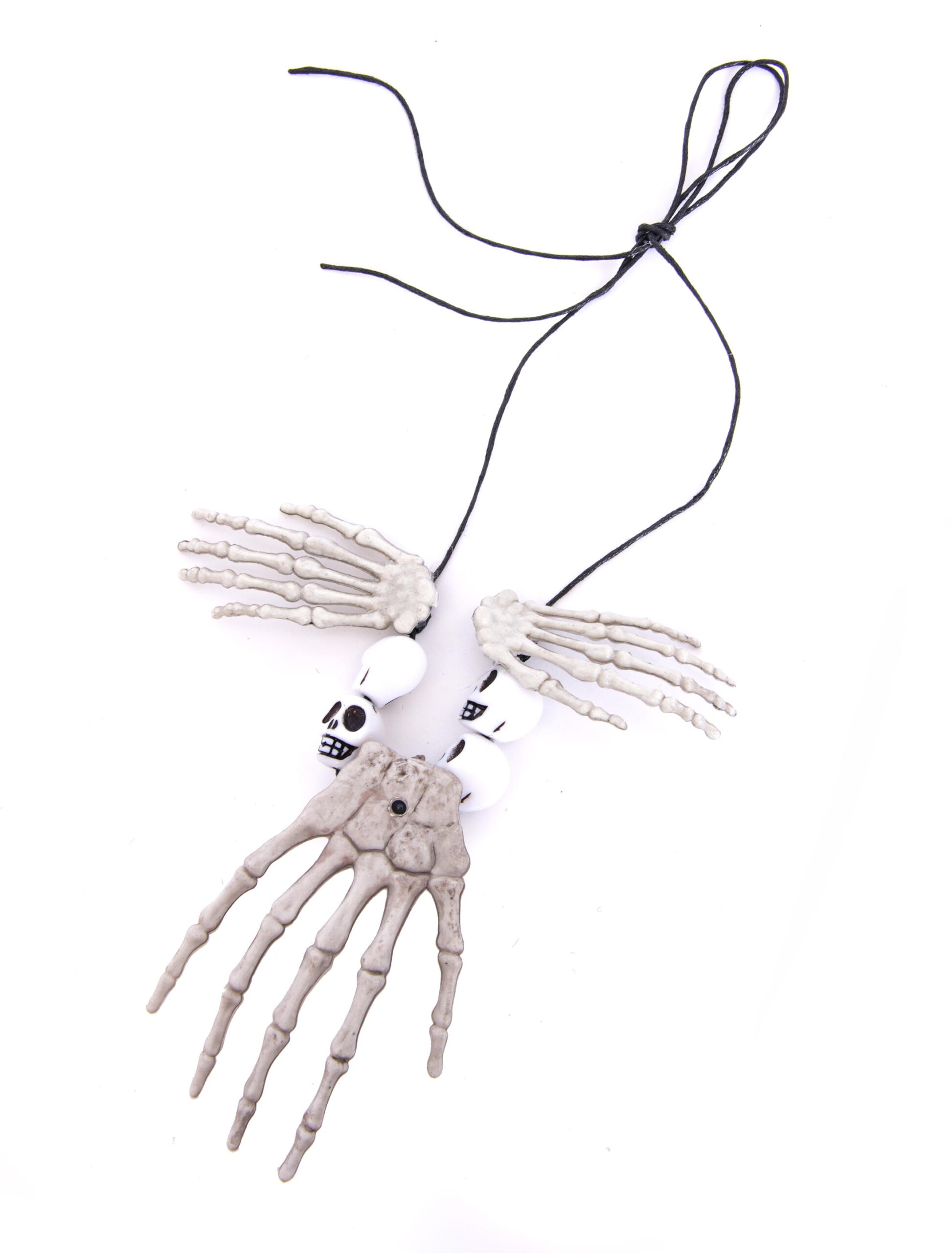 Halloween rückt näher und Du brauchst noch das ultimative Accessoire für Dein Kostüm? Diese tolle Halskette mit Skeletthänden und kleinen Schädeln wird Dich begeistern! Die Kette ist zum Binden, sodass Du sie nah am Hals oder tiefer tragen kannst. Doch auch als Dekoration am Gürtel oder am Hexenhut ist die Kette ein absoluter Blickfang.