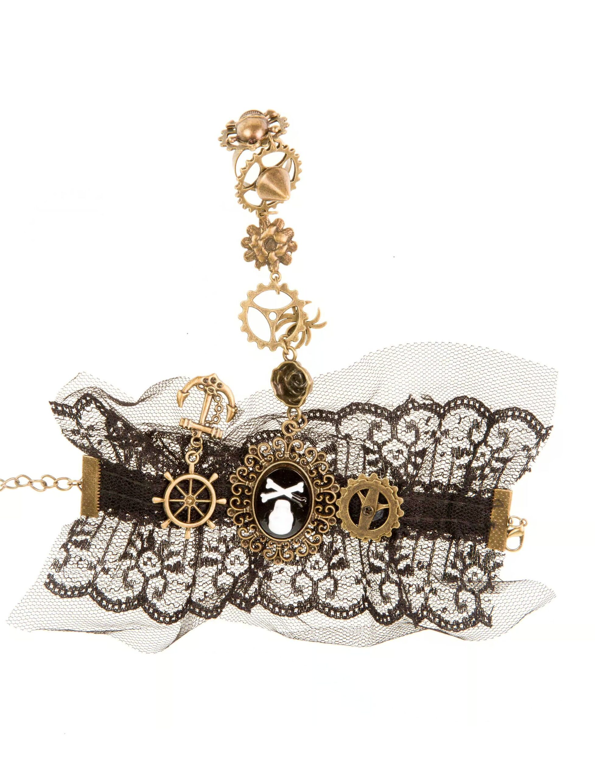 Egal ob Steampunk, Piratin oder Gothic-Queen: dieses Spitzenarmband mit Schädelring und kleinem Totenkopf-Amulett gibt Deinem Kostüm den letzten Schliff! Das goldene Kettchen aus Zahnrädern dient als Verbindung zwischen Armband und Ring, der mit einem kleinen Schädel verziert Deinen Finger schmückt. Das perfekte Accessoire für Dein Outfit!