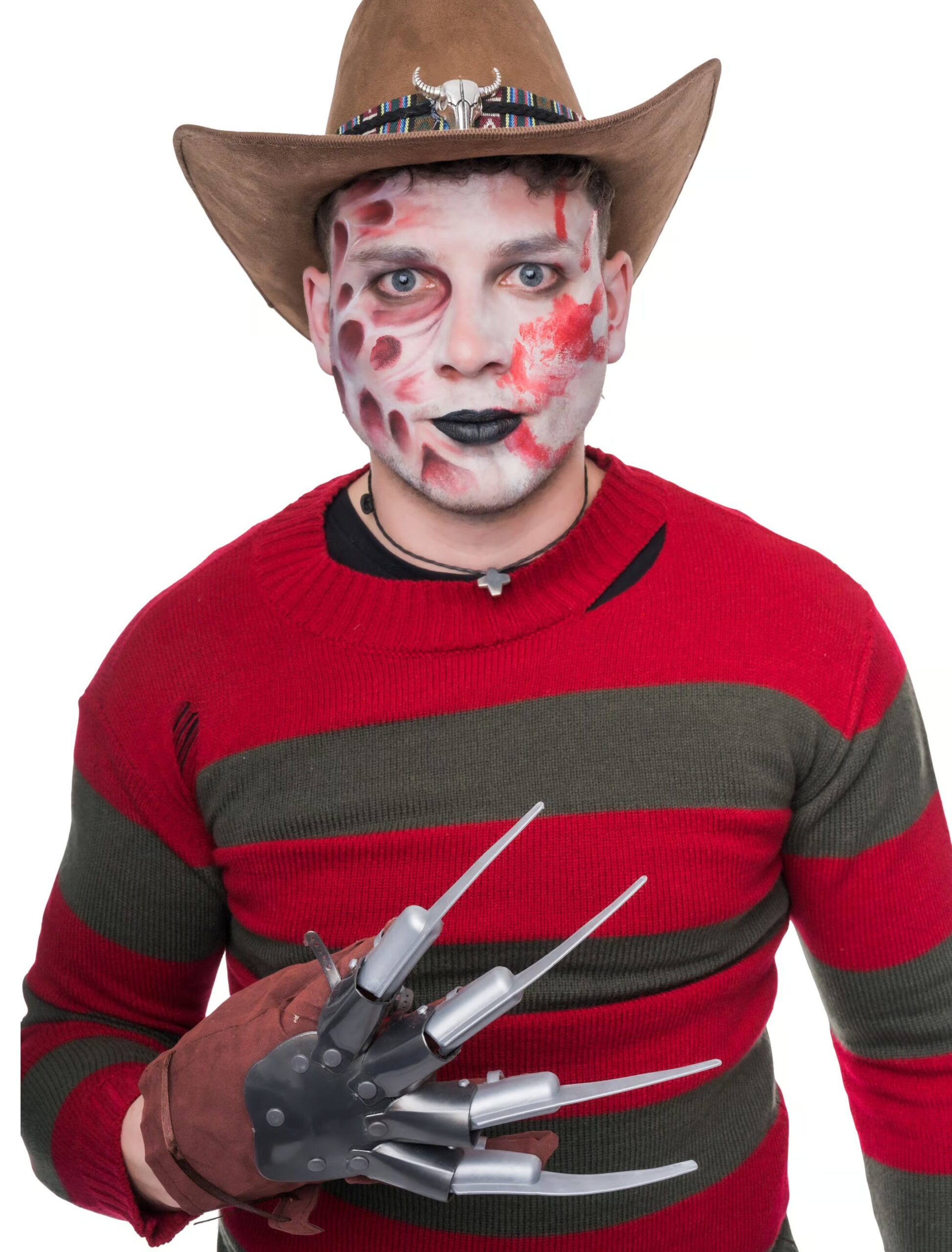 Dieser schaurig-schöne Handschuh Horror Albtraum sorgt bei seinen Opfern für schlaflose Nächte. Das Halloween Slasher KostümZubehör besteht aus einem braunen Handschuh mit vier schwarz-silberfarbenen Klingen an den Fingern und ist ein Muss für jeden Fan des Horrorkinos. Natürlich kannst Du mit dem gruseligen Accessoire auch an Fasching auf Teenagerjagd gehen.