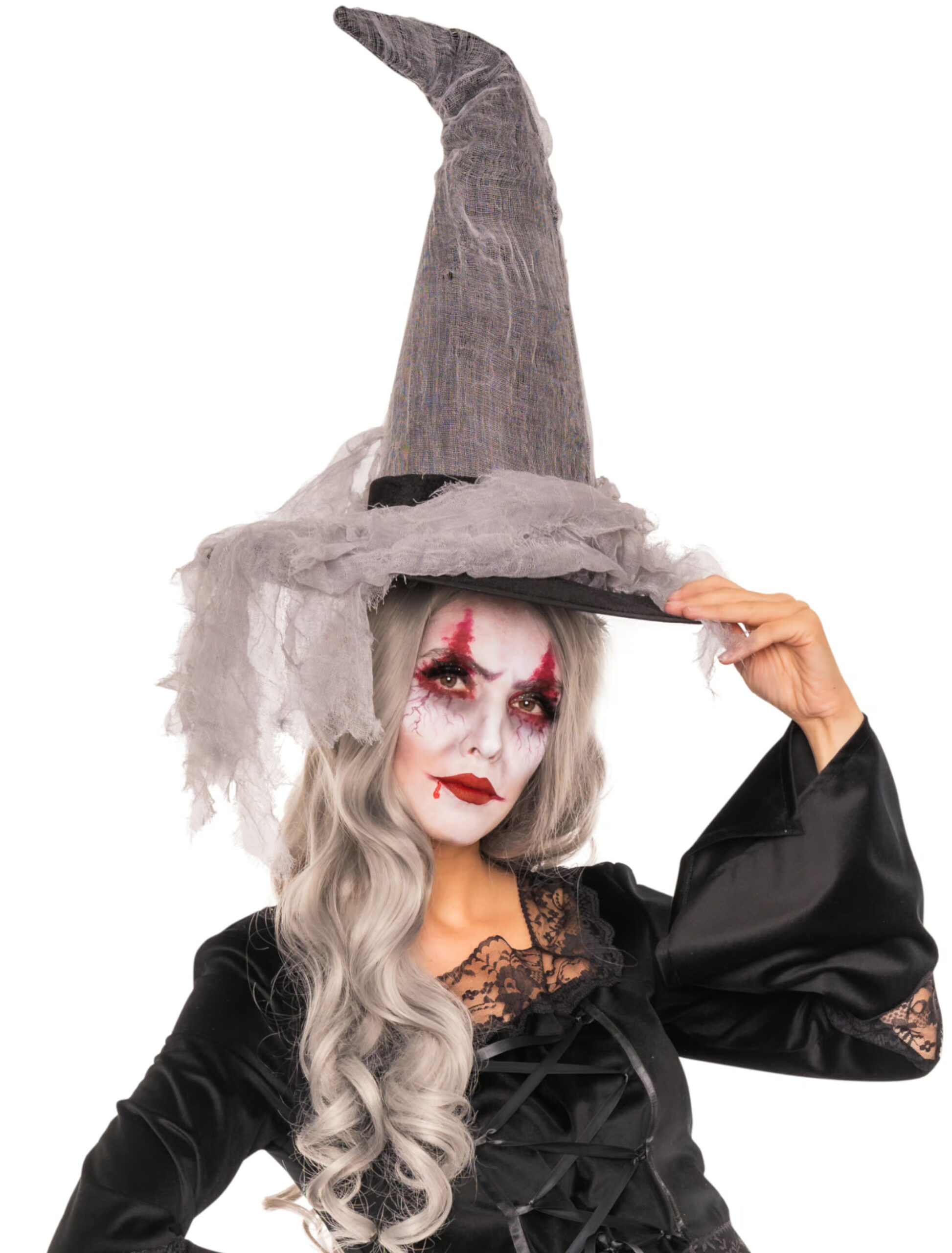 Ein unabdingbares KostümZubehör für eine richtige Hexe ist unser spitzer, grauer Hexenhut in Samt-Optik mit dem schwarzen Band und dem zerfetzten grauen Tüllschleier der an der breiten Krempe hängt. Er ist nicht nur die perfekte Ergänzung für Deine gruselig schönen Verkleidungen zu Halloween, sondern auch auf Horrorpartys, zum Fasching und Karneval wirst Du mit den entsprechenden Kostümteilen aus unserem Shop als furchteinflößende Hexe gut ankommen.