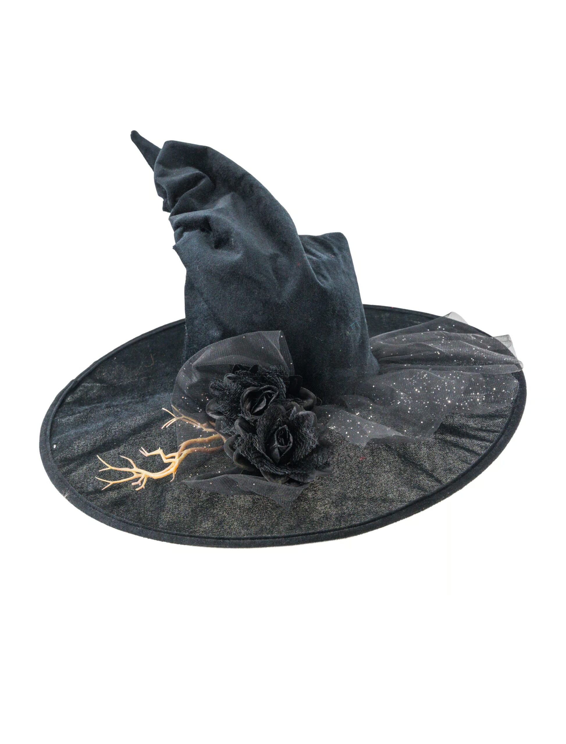Mystisch, magisch, märchenhaft – unser Hexenhut bringt echtes Zauber-Feeling in dein Kostüm! Der klassische Spitzhut wird durch kunstvolle Rosen, verwobene Wurzeln und schimmernden Tüll zu einem echten Hingucker. Perfekt, um als stilvolle Hexe durch Halloween-Partys, Karneval oder Walpurgisnächte zu wirbeln. Mit diesem Hut auf dem Kopf bist du garantiert die Schönste auf dem Hexenbesen!