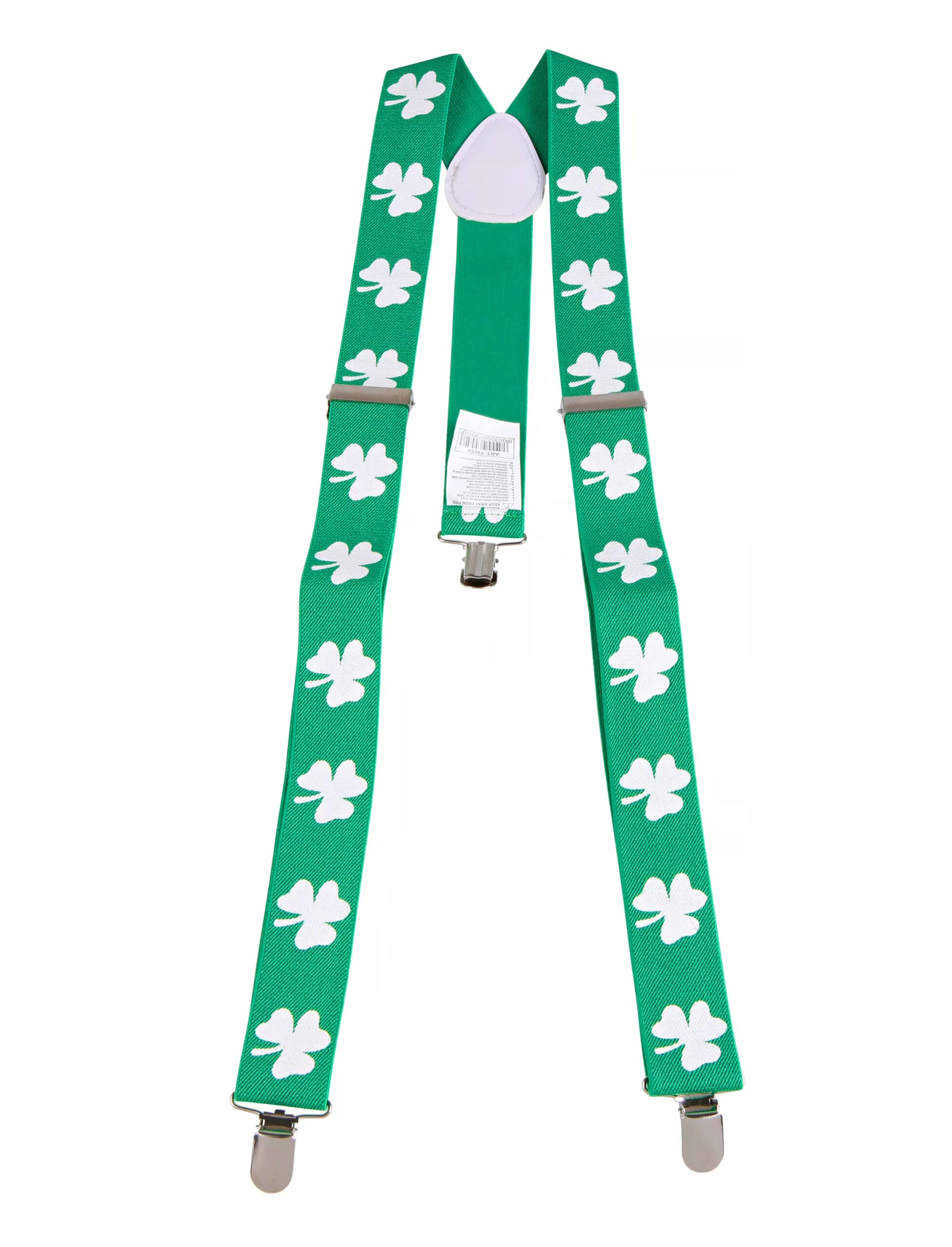 Du bist zu einer St. Patrick’s Day-Party eingeladen und suchst noch den letzten Schliff für Dein Outfit? Gar kein Problem! Diese grünen Hosenträger mit weißen Kleeblättern verwandeln Dein Kostüm in Nullkommanichts in einen richtigen Eyecatcher. Die Hosenträger bestehen aus 100% Polyester. Die idealen Hostenträger zu Deinem St. Patrick’s Day Kostüm!