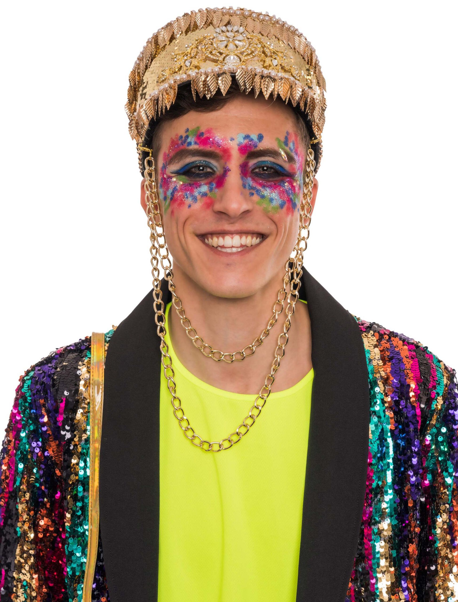 Du bist noch auf der Suche nach dem passenden Kostüm für die nächste Fete? Mit diesem durch goldene Pailletten, Strasssteinen und Kristallen verzierten Hut bist Du der absolute Blickfang an Fasching oder auf einem Festival. Für einen Auftritt wie bei den großen Umzügen an Karneval ist er eine todschicke Ergänzung für Deine Verkleidung.