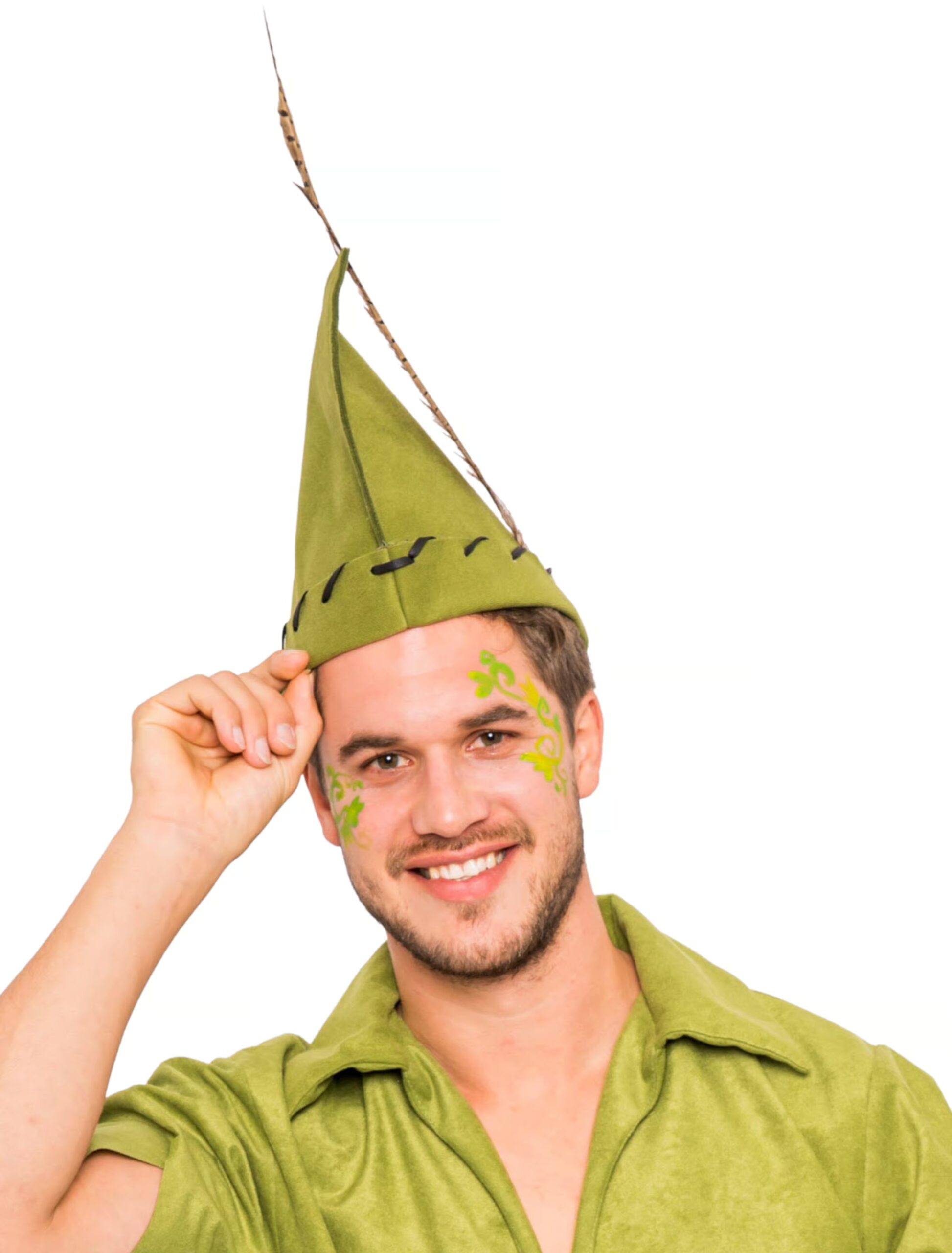 Ein oliv-grünes Highlight, das Dich zum Hingucker auf jeder Motto- und Karnevalsparty macht! Der hübsche und authentische Robin Hood-Hut mit der charakteristischen Spitze ist mit schwarzen Schnüren und einer großen seitlichen Feder geschmückt. Dazu passen Stiefel und ein lange grünes Oberteil perfekt. Natürlich dürfen Pfeil und Bogen für Deinen perfekten Auftritt auch nicht fehlen!