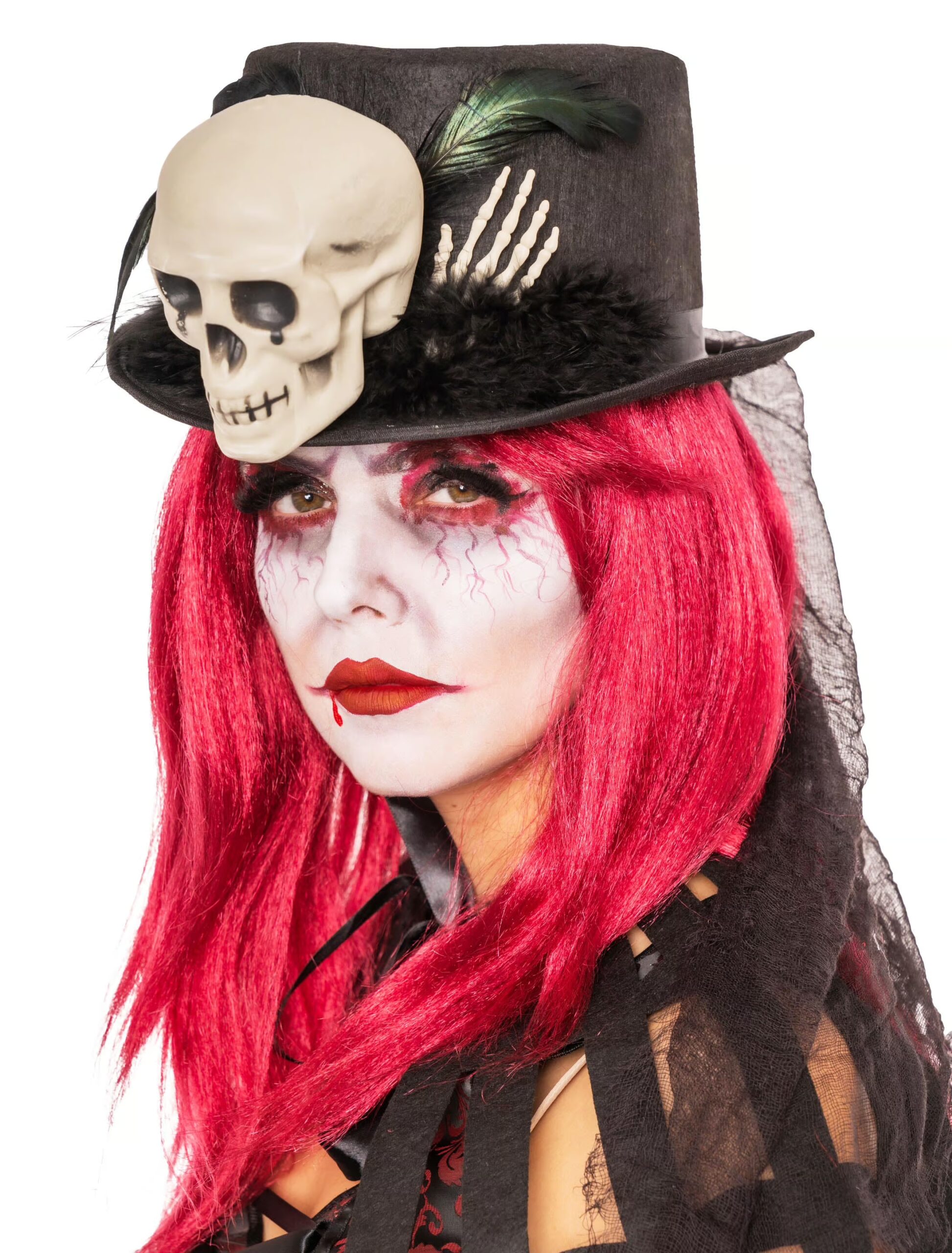 Schaurig schön und genau das Richtige für Deine Halloween- oder Gruselparty ist unser schwarzer, Dia de los Muertos Hut mit Totenkopf. Mit dieser aufsehen erregenden Kopfbedeckung und den passenden Basics aus unserem Shop verwandelst Du Dich in ein einzigartiges Gruselwesen. Der aparte Hut mit dem plastischen Totenkopf und den Skeletthänden sowie dem schwarzen Schleier und den Federn ist ein tolles KostümZubehör, mit dem Du sicher auch auf Mottopartys und zum Karneval beeindruckst.
