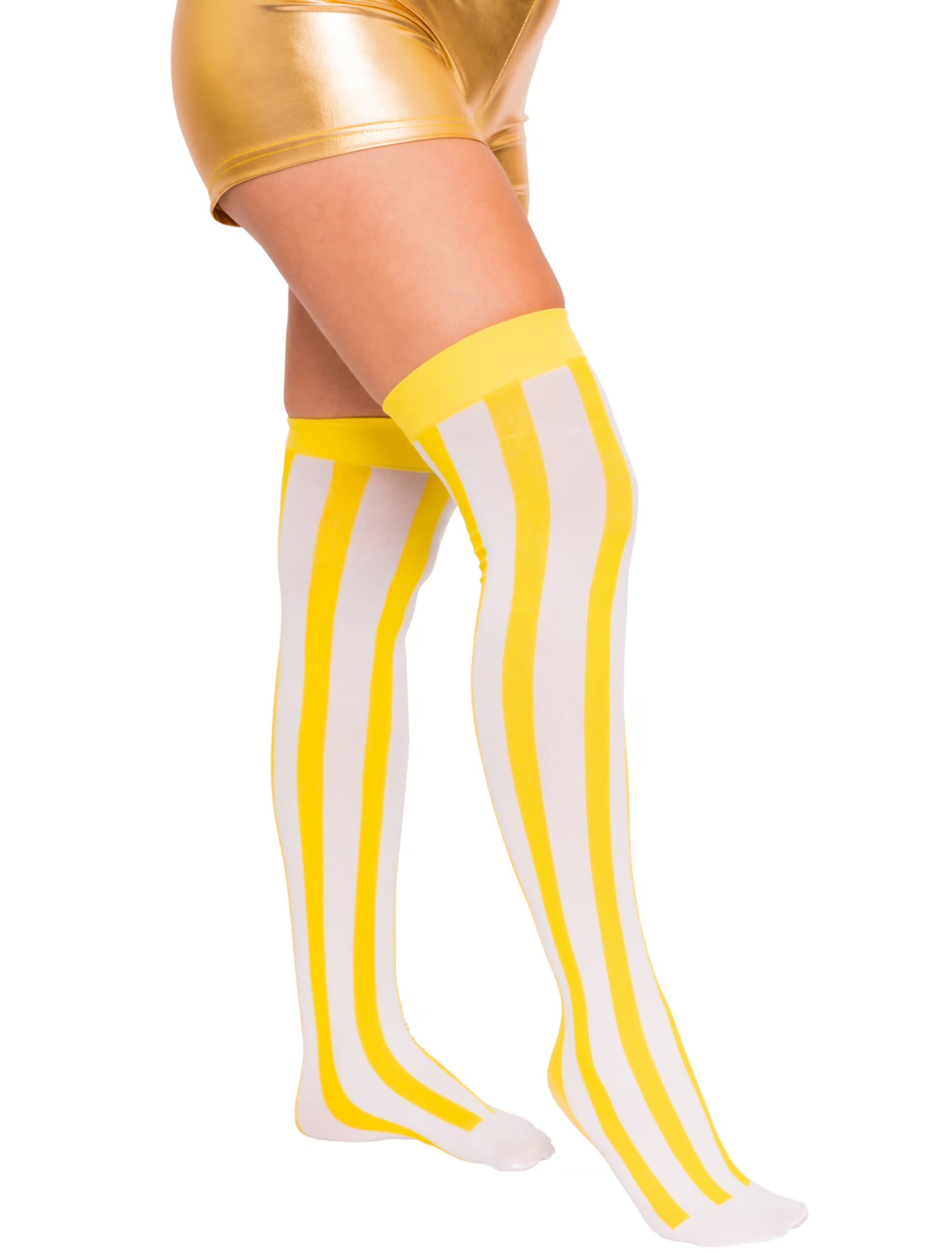 Diese gelb-weißen Original Jeck im Sunnesching Overknee Strümpfe dürfen bei Deinem Sommer-Outfit einfach nicht fehlen. Der knallgelbe Bund mit den weiß-gelb senkrechten Streifen machen die Overknees zu einem echten Hingucker. Die Strümpfe kommen in Einheitsgröße und bestehen aus einem Polyester-Elasthan-Gemisch. Mit diesen femininen Overknees zeigst Du Dich von Deiner schönsten Seite! Größe: One size = S/M. Unser Model ist 170 cm groß.