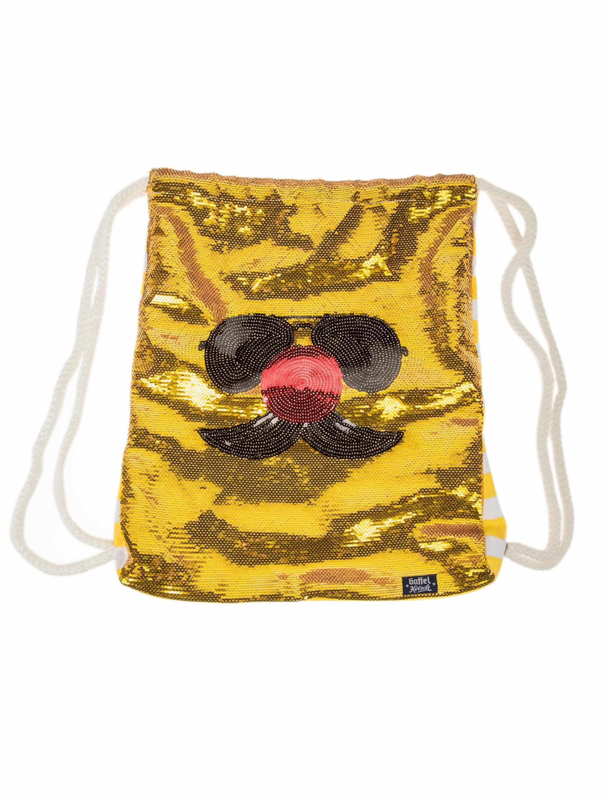 Dieser schicke Turnbeutel im strahlenden Gold aus Pailletten in der Front und hinten ganz einfach in weiß-gelben Streifen darf bei deinem sommerlichen Outfit nicht fehlen. Der glitzernde Turnbeutel ist in der Mitte mit dem lustigen Sunnesching-Logo (Sonnenbrille, Pappnase, Schnäuzer) bedruckt. Ein perfektes Transportmittel für ein Flasche Wasser (oder andere Getränke), Deine Brille oder andere Utensilien. Mit diesem Pailletten Turnbeutel wird Dir bei der nächsten Sommerparty auf jeden Fall Beachtung geschenkt.