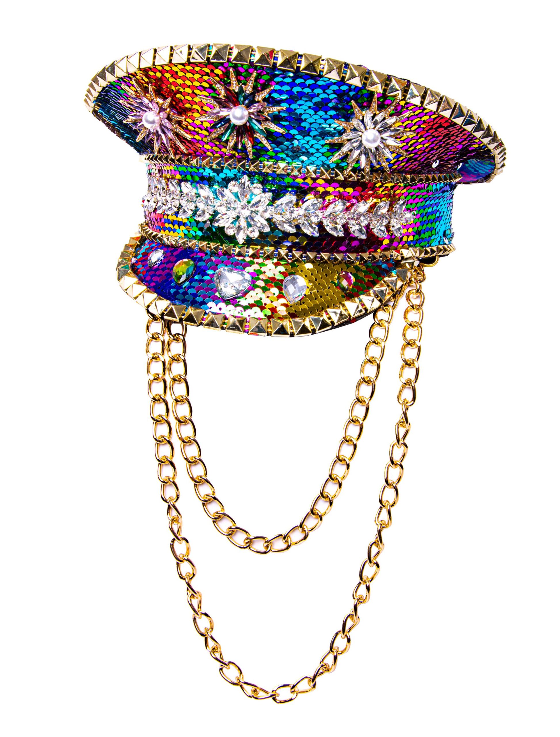 Bunt, stylisch und extravagant: So präsentiert sich diese tolle Kappe, die über und über mit Pailletten in allen Farben des Regenbogens verziert ist. Sie eignet sich für den großen Auftritt im Karneval (oder Fasching) genauso wie für den Besuch bei einem Festival. Auch auf einer Regenbogen Party wirst du mit der Kappe der absolute Star sein! Die bunte Kappe ist mit einer goldfarbenen Kette ausgestattet und hat im Inneren ein praktisches Gummiband, das stets für den perfekten Sitz sorgt.