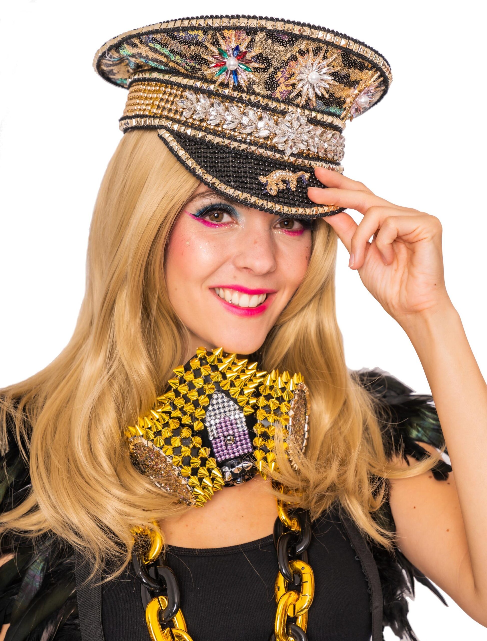 Zum Festival, Karneval oder Fasching möchte man gut aussehen und sich hübsch verkleiden. Unsere Kappe besteht zu 90% aus Polyester und zu 10% aus Plastik. Das stylische Accessoire ist für einen besseren Halt mit einem Gummiband ausgestattet. Die Kappe ist mit einem goldenen Salamander geschmückt. Das Leoparden-Muster mit gold-irisierenden Pailletten und die goldenen Nieten & Kristalle runden den Look ab.