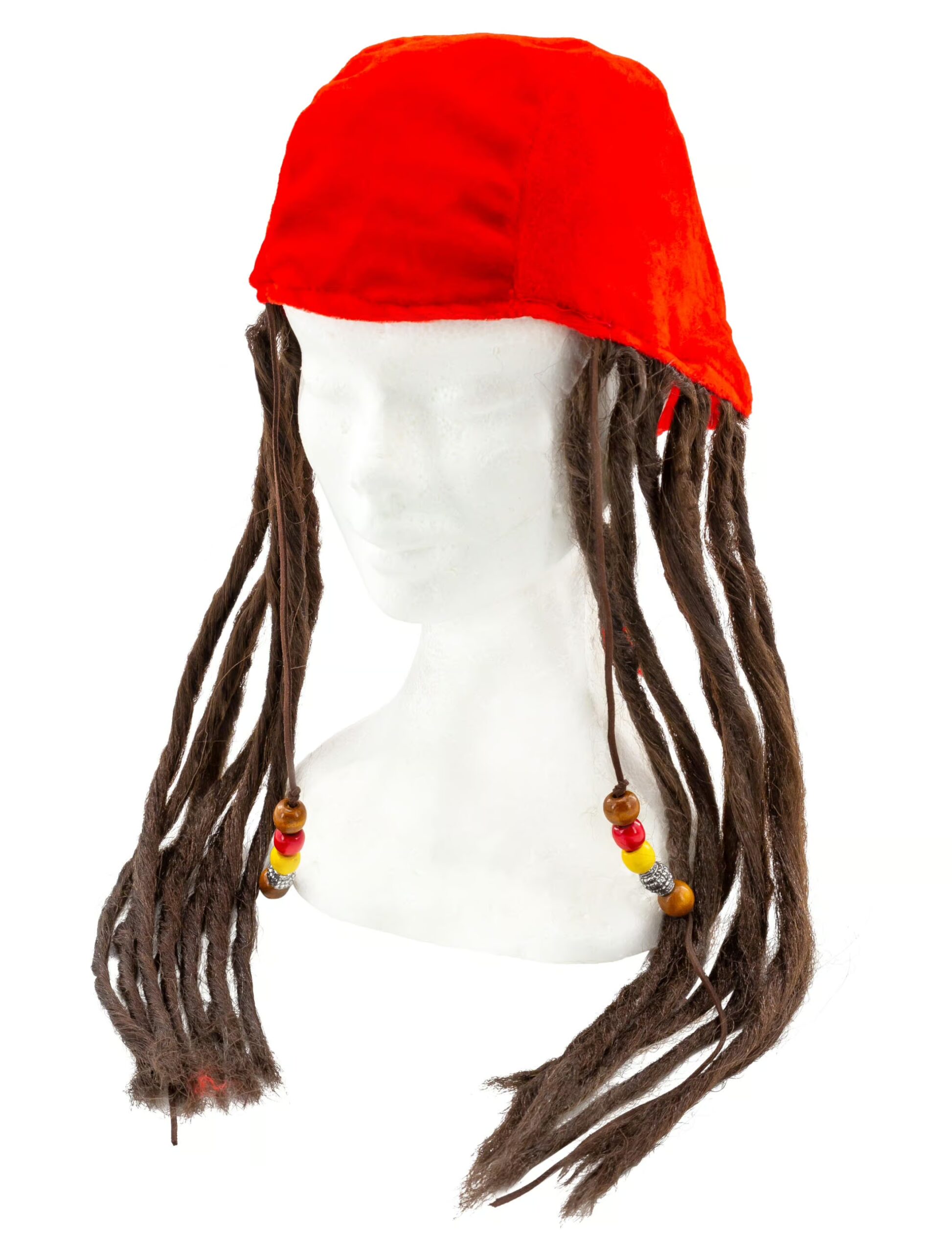 Dieses Jahr machst Du als abenteuerlustiger Pirat die Karnevalswelt unsicher? Für Deinen perfekten Auftritt fehlt Dir nur noch die passende Kopfbedeckung? Dann kommt diese Piraten Kappe wie gerufen! Die rote Kappe ist mit vielen braunen Dreadlocks sowie zwei braunen Kordeln mit bunten Perlen verziert. Mehr Piraten-Feeling geht nicht!