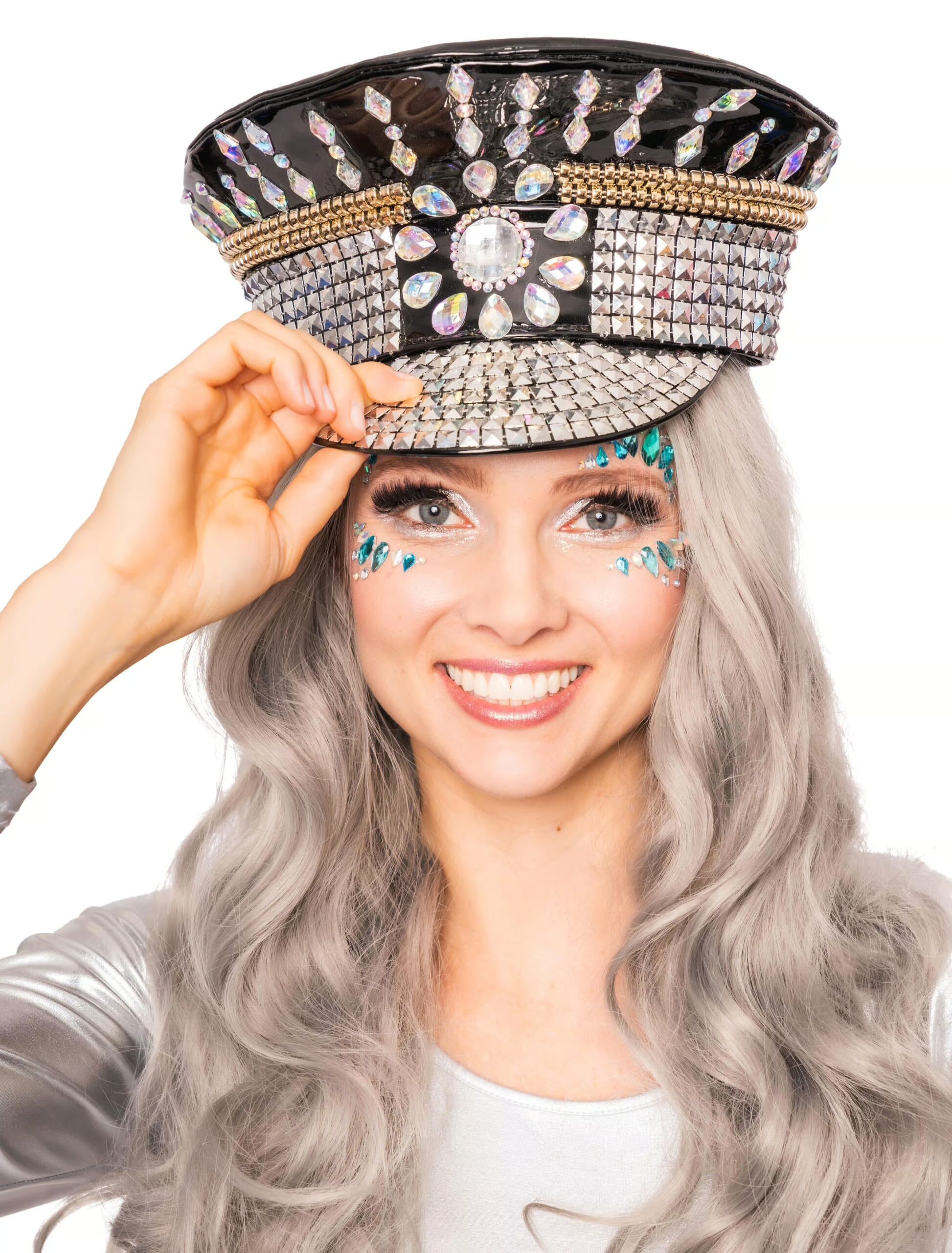 Polizist, 80er Jahre oder Festivalgirl? Diese schicke Kappe lässt die Frage unbeantwortet und händigt sie stattdessen an den Betrachter weiter. Egal ob für ein Festival, Karneval oder Fasching, die mit edel wirkenden Steinen besetzte Kappe im Beamten-Look vermittelt den perfekten Mix aus Autorität und Verspieltheit und sorgt so für die nötige Aufmerksamkeit.