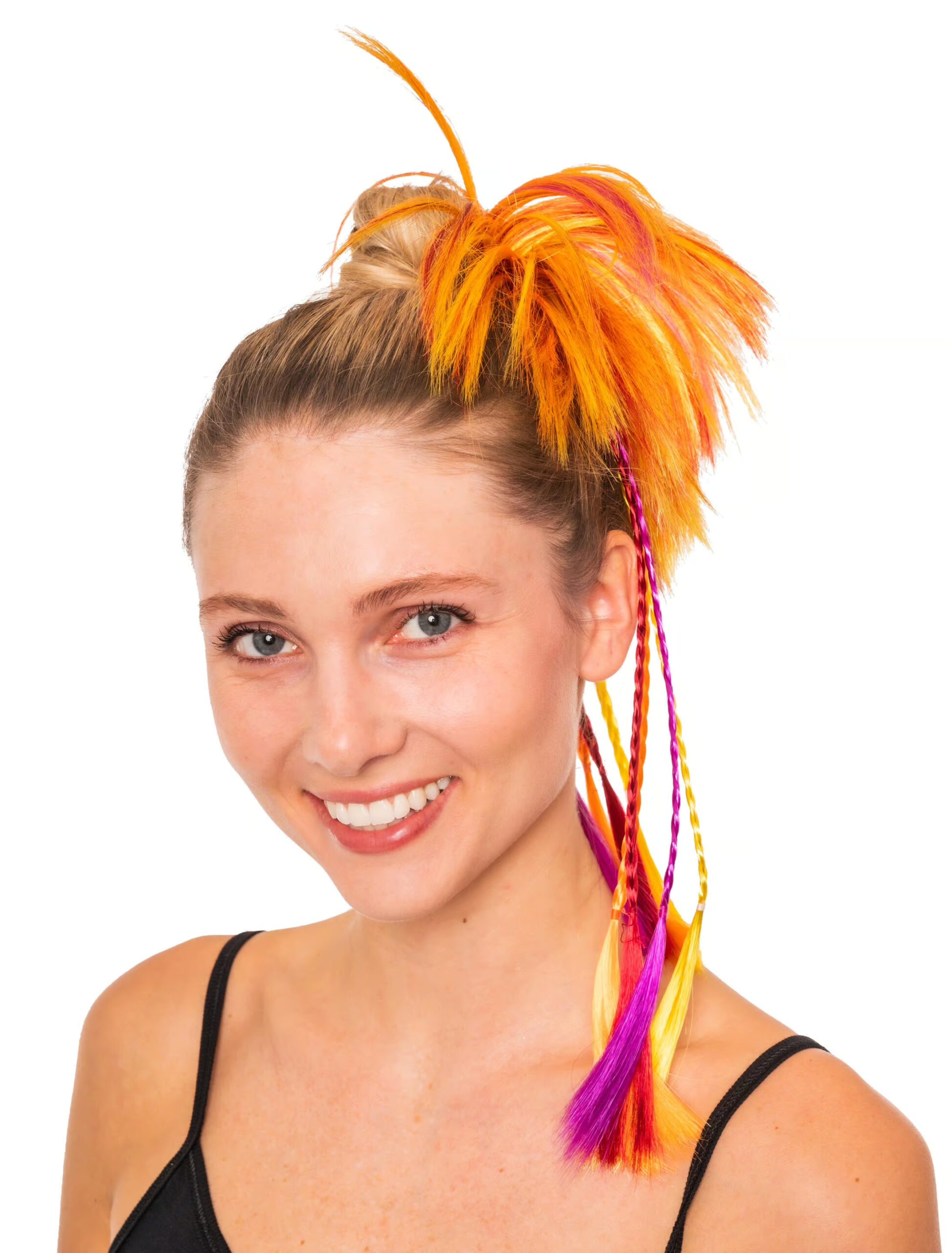 Mit diesem schicken, bunten Kopfschmuck hast Du ein raffiniertes und praktisches Accessoire um Deinen schrillen und kreativen 80er-Party Frisuren, ohne großen Aufwand so richtig aufzupeppen. Das Haarteil mit der sinnreichen Haarklammer und den farbigen Zöpfen und Strähnen passt sowohl perfekt zu den bunten Flower Power Kostümen als auch zu glitzernden und glänzenden Disco Outfits aus unserem Shop. Es ist ein Eyecatcher, mit dem Du zum Fasching und Karneval sowie auf Mottopartys garantiert nicht übersehen wirst.