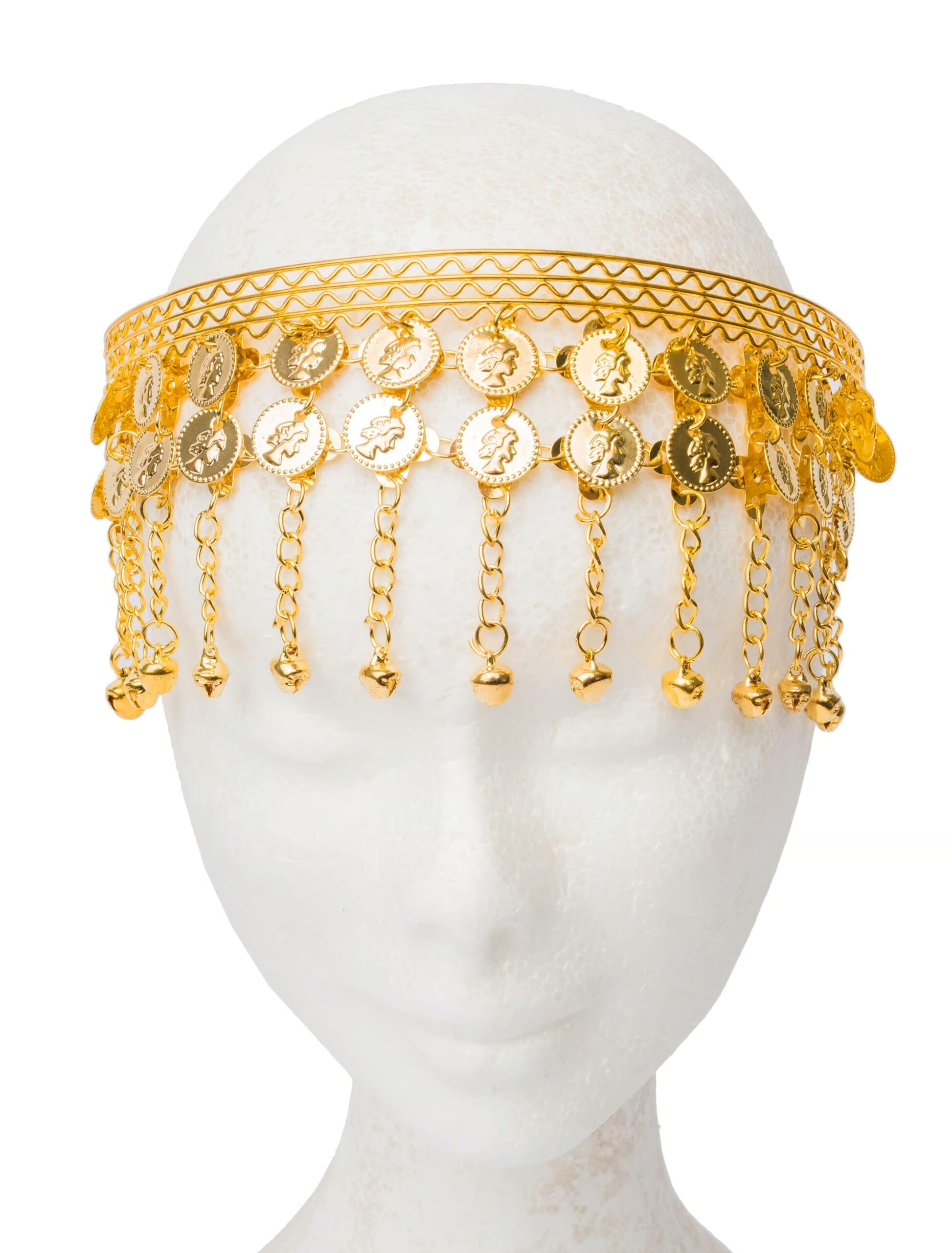 Dieser Kopfschmuck mit Münzen und Glöckchen ist in der Farbe gold ein echter Hingucker. Die Länge des Behanges ist ca. 7 cm lang, der Haarreif selbst hat eine Länge von 1,5 cm. Das Material, aus dem der Haarreif gefertigt ist, ist Metall. Man kann das Schmuckstück mit einem weißen Gewand im ägyptischen Stil zu Karneval und Mottopartys tragen.