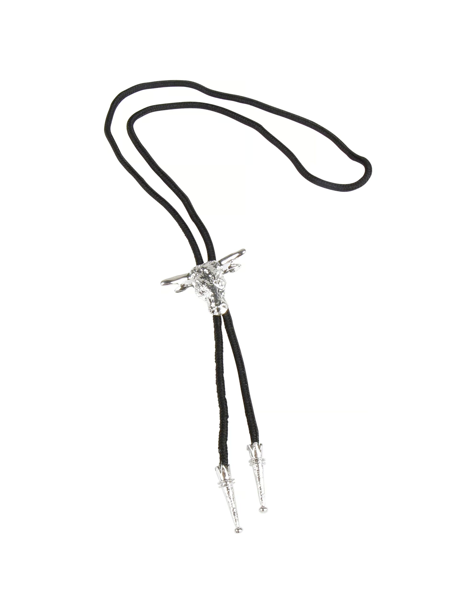 Tücher? Nein! Stoff-Krawatten? Zu spießig! Ein waschechter Cowboy trägt eine Kordel Krawatte wie diese. Sie besteht aus einem schwarzen Band, welches in der Mitte durch einen silberfarbigen Bullenkopf-Anhänger zusammen gehalten wird. Die beiden Enden der Kordeln sind ebenfalls mit silbernen Applikationen verziert. Zusammen mit Hut, Hemd, Jeans, Chaps und Stiefeln ein stilechter Eyecatcher!