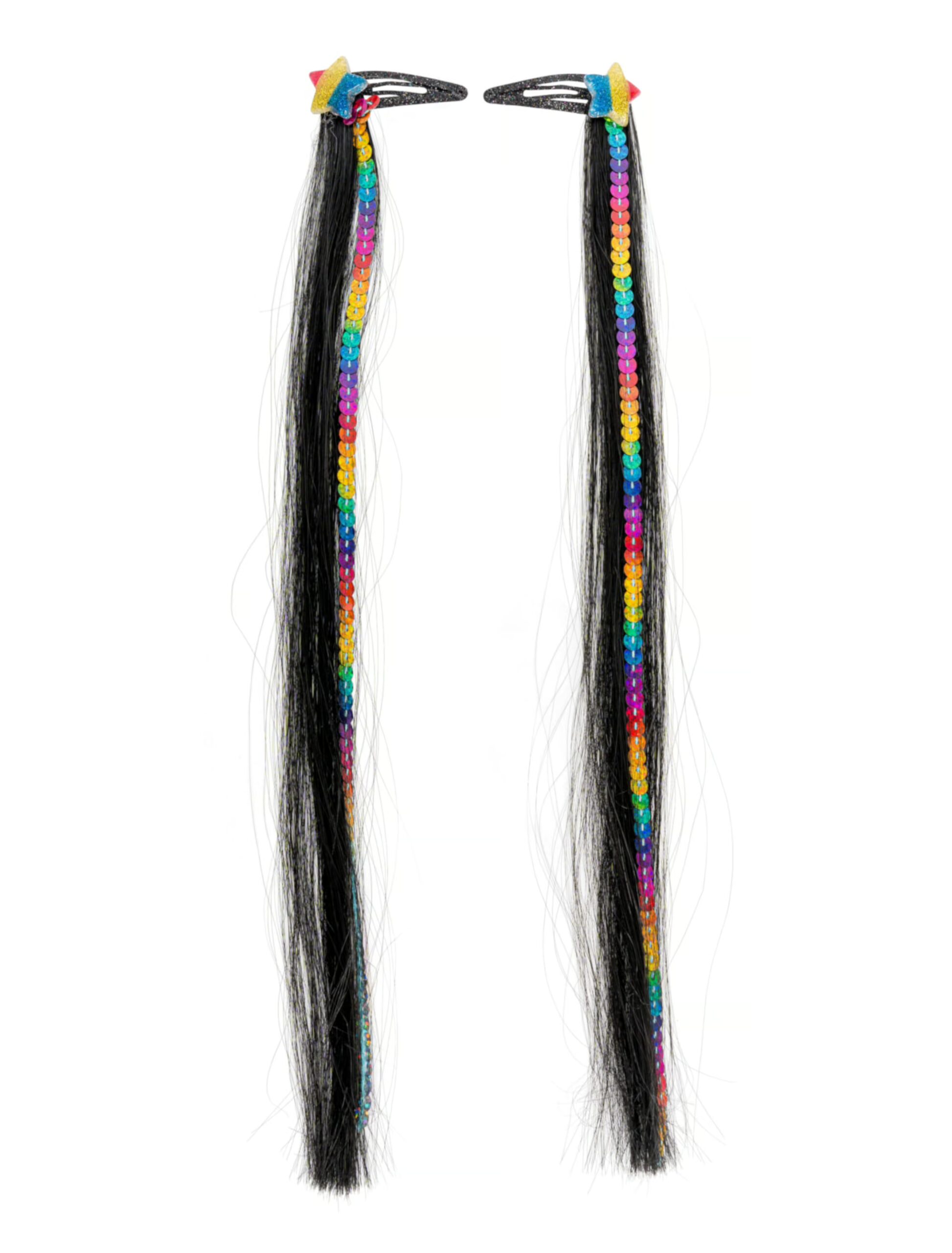 Mach das berühmte Thema Einhorn zu Deinem Thema an Karneval, Fasching oder Mottoparty. Diese Haarverlängerungen schwarz/bunt sind bei einem Einhorn Outfit ein echter Hingucker. Die Haar Extensions mit glitzernden Sternen Haarklammern haben eine Länge von ca. 35 cm und bestehen aus 100% Polyester. Diese Haarsträhnen passen auch ideal zu Stern Kostümen.