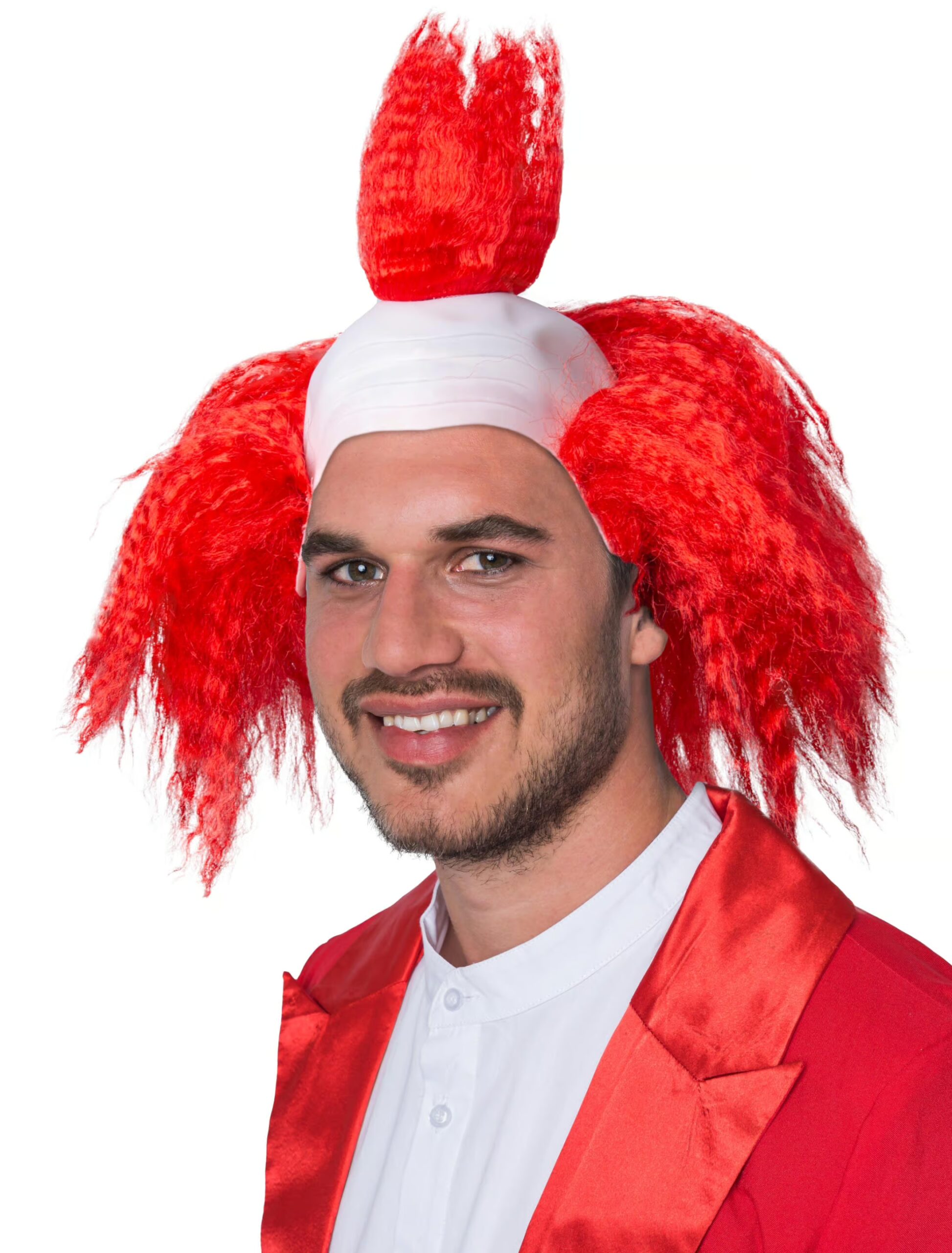 Ob auf Halloween oder auf Karneval: Diese ausgefallene Perücke eignet sich für beide Anlässe. Sie besteht aus einer Glatze, die seitlich und oben von abstehenden, roten Kunsthaar geschmückt wird. In Kombination mit den passenden Kleidungsstücken verwandelst Du Dich entweder in einen gruseligen Horror-Clown oder aber in einen lustigen und gut gelaunten Zirkus-Clown. Du hast die Wahl!