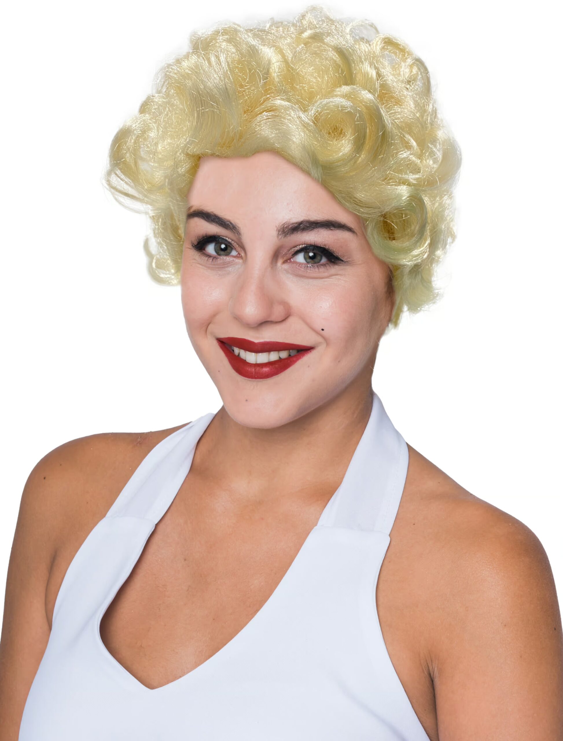 Unsere blond, gelockte Kurzhaar Perücke aus Polyester ist ein vielseitig einsetzbares KostümZubehör und kann von Dir individuell zu den unterschiedlichsten Kostümen und Kombinationen aus unserem Shop getragen werden. Die an Marilyn Monroe erinnernde Perücke ist nicht nur die perfekte Ergänzung zu flippigen 80er Outfits und Show Kostümen, sondern auch ein echter Eyecatcher. Mit ihr hast Du ein tolles Accessoire für angesagte Mottopartys sowie zum Fasching und Karneval.