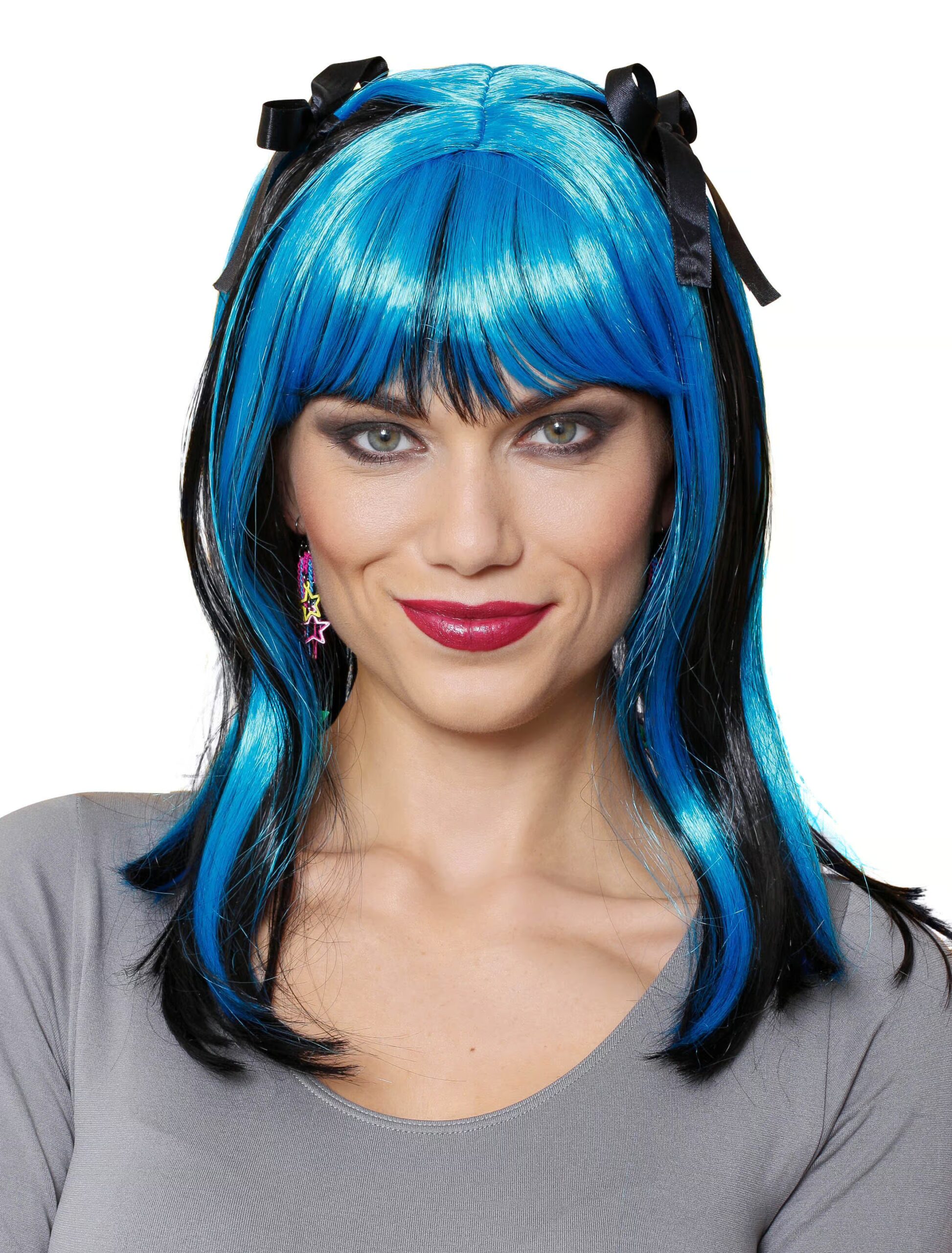 Mit dieser schwarz-blau melierten Perücke bekommst Du eine Haarpracht vom Feinsten verpasst! Die mittellangen, glatten Haare mit Pony sind mit zwei schwarzen Schleifen versehen. In Sekundenschnelle verwandelst Du Dich mit dieser Frisur in eine völlig andere Person. Ein echter Hingucker und die ideale Ergänzung für Dein Kostüm!