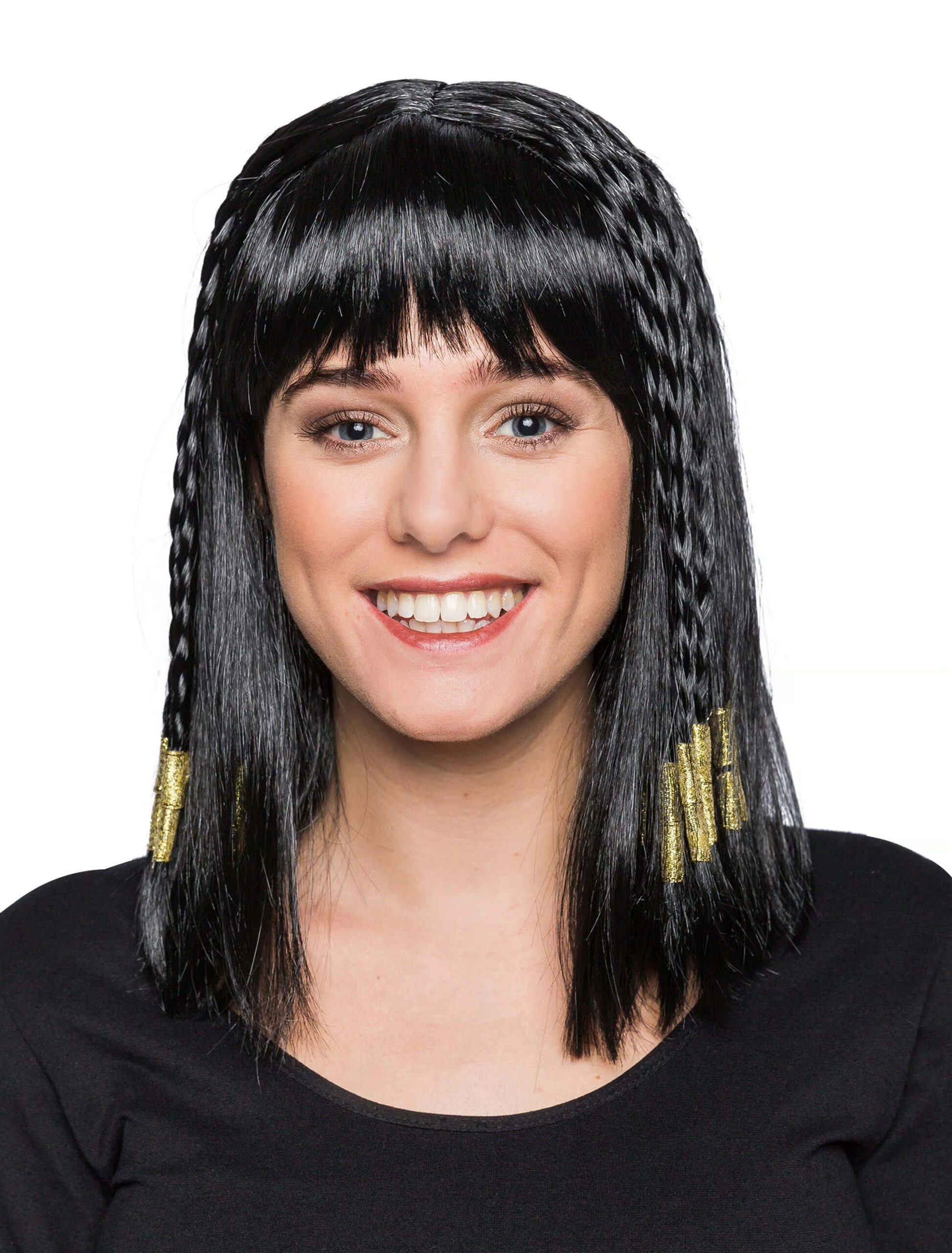 Du bist auf der Suche nach einer passenden Kunsthaar Perücke für Dein ägyptisches Cleopatra Kostüm? Unsere Perücke Nofretete in Schwarz mit goldenen Akzenten darin darf hier nicht fehlen. Diese schöne, schulterlange Perücke passt wunderbar zu Deinem Kostüm an Karneval und Fasching. Die Perücke ist aus 100% Polyester gefertigt. Das Produkt beinhaltet nur eine Perücke.
