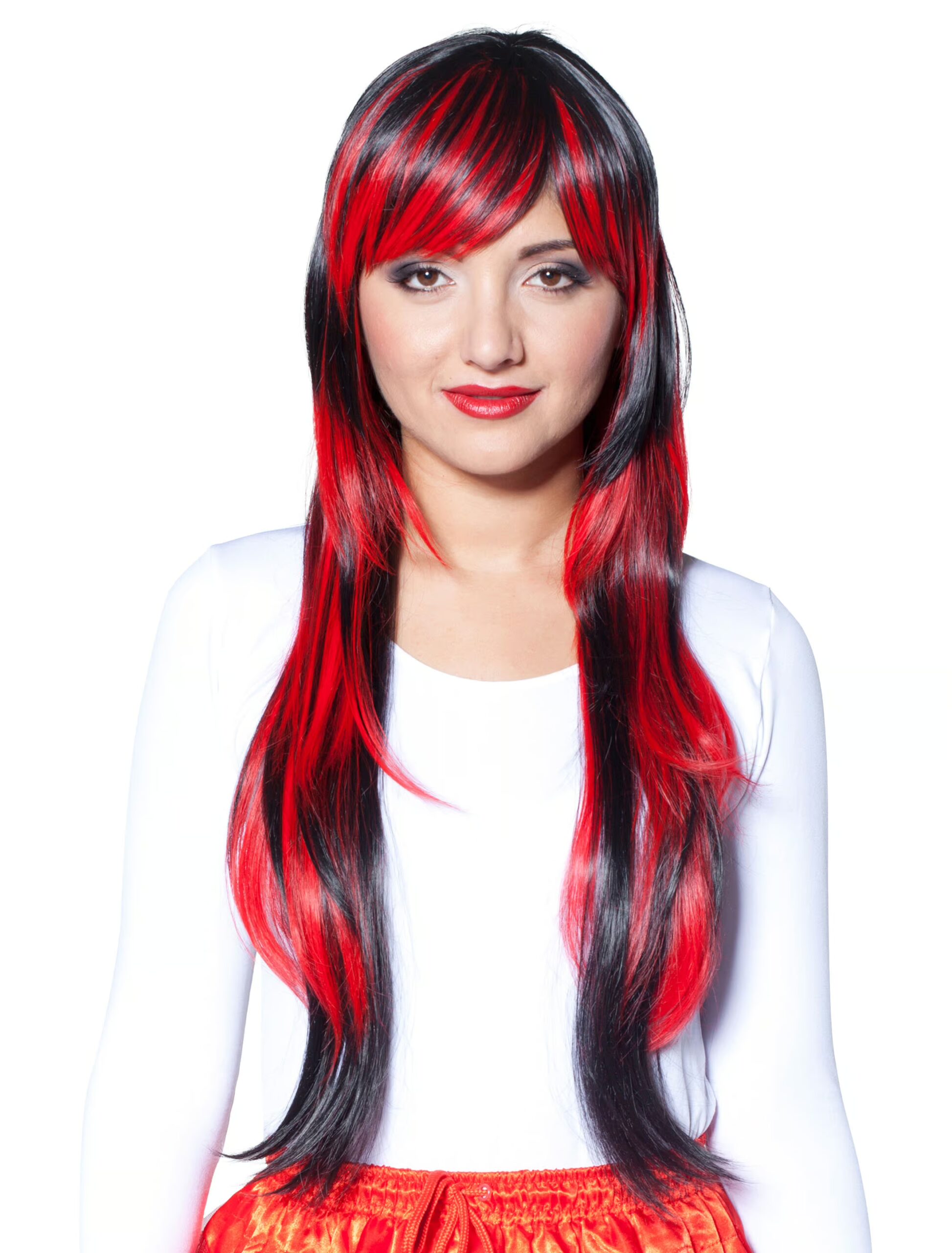 Diese prächtige Perücke verleiht Dir ein teuflisch gutes Aussehen! Die pechschwarzen, langen Haare mit feuerroten Strähnen sind genau der richtige Kopfschmuck für Deinen Grusel-Look als Teufel, Hexe, Dämonin oder finstere Gothic-Lady. Die perfekte Frisur für Karneval, Halloween oder die nächste Mottoparty!