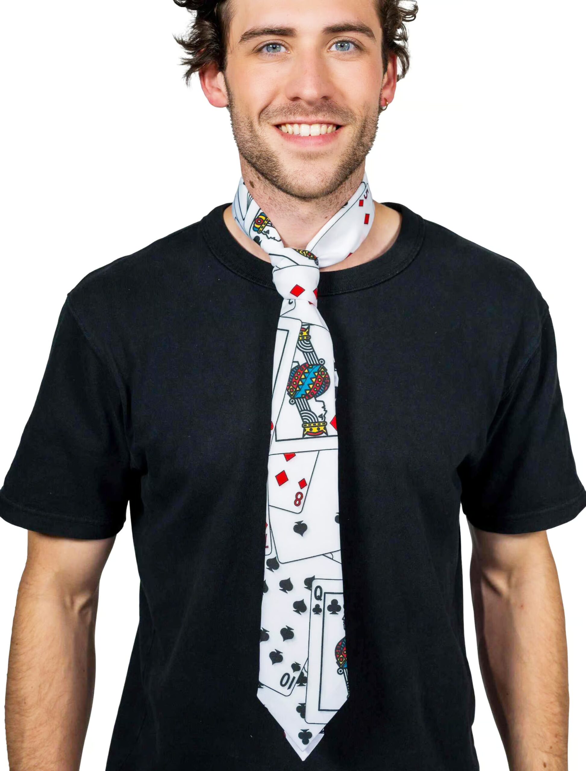 Du hast ein Pokerface? Perfekt, dann fehlt nur noch die passende Krawatte! Mit unserer Poker Krawatte bringst du den Casino-Flair direkt in deinen Look. Das Spielkarten-Muster ist der ultimative Trumpf, um auf jeder Party, im Büro oder beim nächsten Spieleabend Eindruck zu machen. Egal, ob du wie ein High Roller aussehen willst oder einfach zeigst, dass du das Leben spielerisch nimmst – diese Krawatte macht aus jedem Outfit einen Jackpot. Ideal für Motto-Partys oder Casinonächte!
