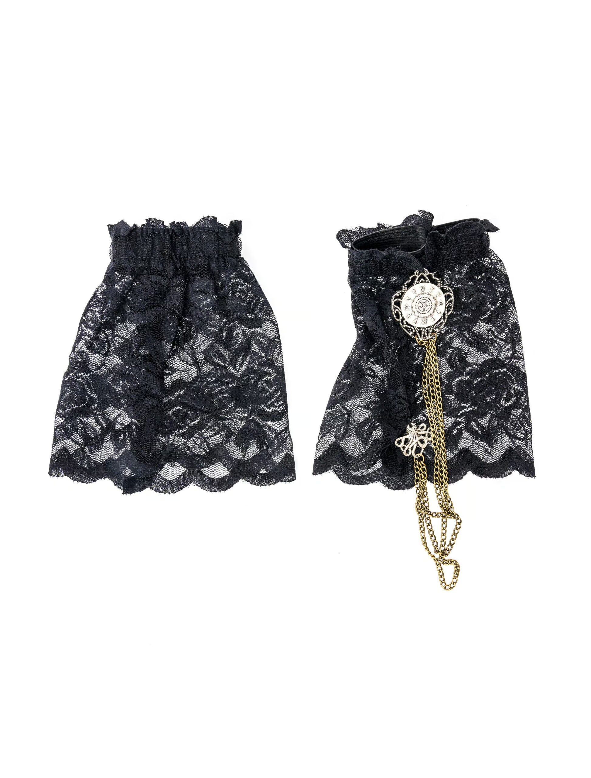 Manschetten können Dein Kostüm zum Thema Steampunk und Halloween wunderbar aufwerten. Diese hier bestehen aus schwarzer, filigraner Spitze. Der enthaltene Gummizug verspricht einen optimalen, sicheren Halt. Weiterhin gibt es an einer Seite eine Goldkette mit Uhrenemblem und kleinen, feinen Verzierungen. Diese Manschetten sind sehr stilvoll und stellen doch eine tolle Aufwertung für ein schauriges Kostüm dar.