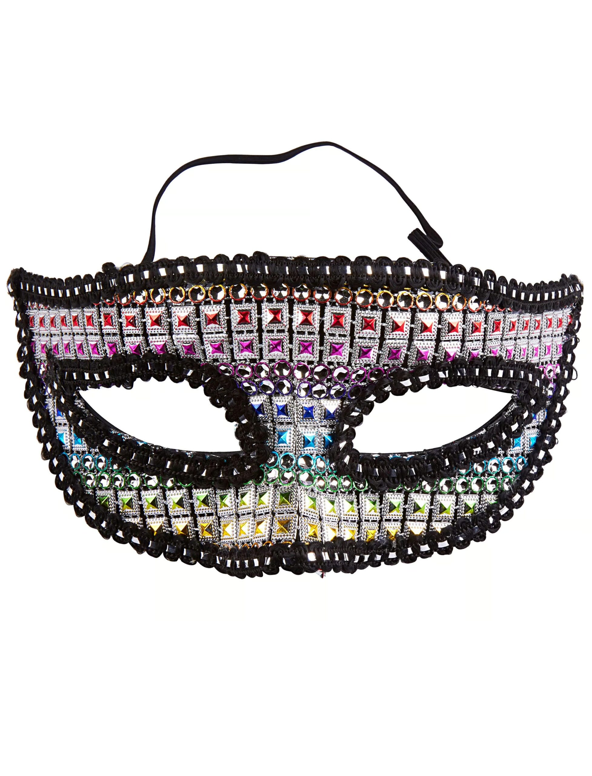 Diese geheimnisvolle Maske zieht alle Blicke auf sich! Zahllose Steinchen in verschiedenen Formen und Farben setzen funkelnde Akzente, während Augenlöcher und die Maske selbst mit einer schwarzen Umrandung versehen sind. Perfekt für Karneval, Halloween oder den nächsten Maskenball!